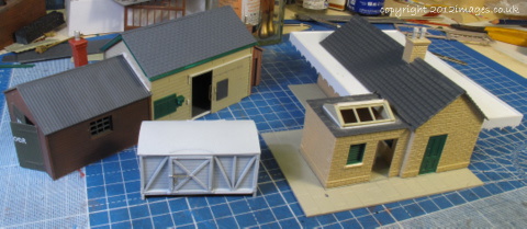 There are a couple of other layout projects that I’m working on, two in 4mm OO, East Dursley, Ashworth WR and New Burn NER 4mm but gauge still to be decided. Today I’ve been finishing the station buildings for East Dursley. This is a small branch line terminus based on the real terminus at Dursley in Gloucestershire and a Barry Norman design in Wild Swan’s Designing a Layout ISBN 1 874103 39 9. These buildings are just about ready for painting, they’ll be undercoated with Halfords white acrylic and then finished with Midland Region red and cream with signage for the 1950-60’s era.