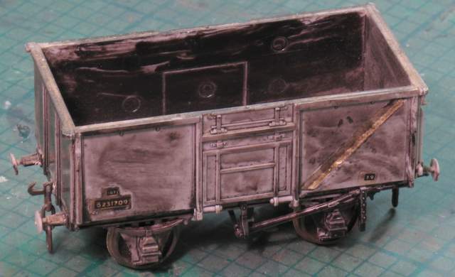 Its a good idea to also have a plastic container underneath the wagon to catch the broken fibres to keep the bench clean and safer, a glass fibre splinter can be very painful and aggravating. Depending on the amount of paint you vary the brush pressure to cut the paint back, and as a rule keep the strokes vertical, this will give a realistic look as the original coat comes away. The brush allows you to get into the corners by the hinges and framework, it also leaves some paint there which adds to the effect. Once I have a bare wagon I repaint the chassis Humbrol 33 matt black by hand, if the wagon inside needs doing I give those a coat too, again remembering to keep brush strokes vertical, so any streaks show the correct orientation. You can also mask the top of the wagon and use the Halfords black spray to do the wagon insides if you have a large number to do, when I was working on a batch of about eight or more that’s the way I usually did it. At this point you should have a wagon with a matt finish from the glass fibre brush and some corrosion left in the corners where the brush can’t reach. You can add to these areas with more patches of rust, hand painted and then cut those back too, if you’re not happy with the result. It takes about half an hour or so to get the wagon to this stage, once you’re comfortable with the technique.