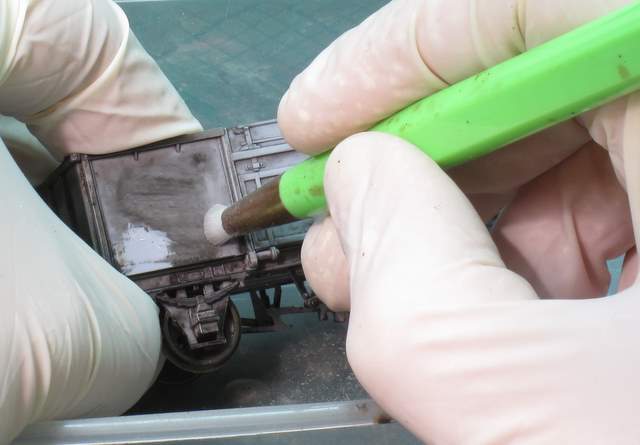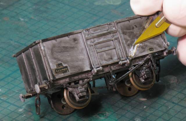 Many of the wagons still had the Airfix Decals, some of these were removed completely, others which could be saved were scratched or brushed clean, taking care to scratch away the thick Airfix carrier transfer film. As we were looking at trains of thirty or so wagons that pass through the scene, we wanted a ‘mass’ appearance rather than specific individual wagons, so having the same number re-occur occasionally is unlikely to be noticed. For this example we’ll look at taking a heavily weathered wagon back to nearly new. The first shot shows one of the typical starting points, the first job is to remove the Airfix transfers, once that is done then wearing the gloves you can start to cut away the original paint.