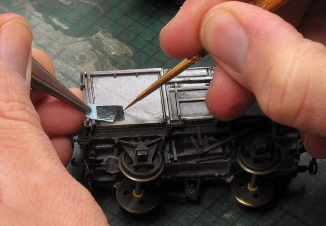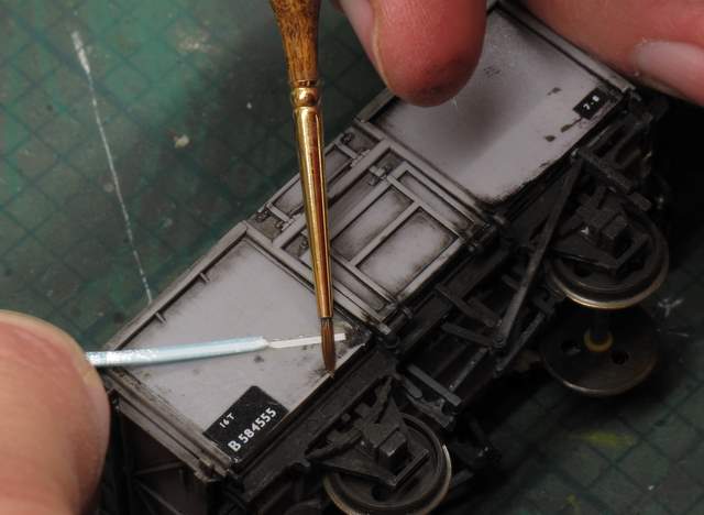 Leave the transfers to dry completely. Once they’re dry check for any ‘silvering’, if you find any use a pin to prick the silvered area and dab Microsol on it, that will release the air and allow the transfer to settle on to the model so you lose the silver effect. You will now have a glossy mineral wagon, and the fastest way to give it a matt coat is again by spraying them. Vallejo make a matt varnish that is available in a spray can. This is also an acrylic and will provide you with a good topcoat cover that is a very dull matt crucially will not affect the models plastic, paint, laquer or transfers you have already applied.