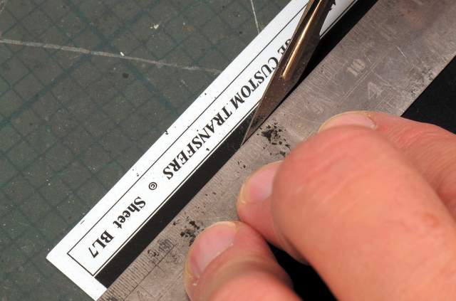 In the best traditional manner, use lukewarm water to dip the transfer in to release it from the backing paper. Once it’s started to slide I put a light wash of Microset decal solution on the area where the transfer will go. This starts to cut the oils in the paints and helps the glue on the transfer grip the surface. This helps the transfer conform to the model surface and minimizes the amount of air that can get trapped underneath. The numbers, wagon weight, tare data and white end stripes are all on CCT sheet BL1, and they are all printed on the same sheet of backing film. I use a scalpel and ruler to cut as near as I can to the markings, leaving a minimum of the backing film surrounding the printed areas.