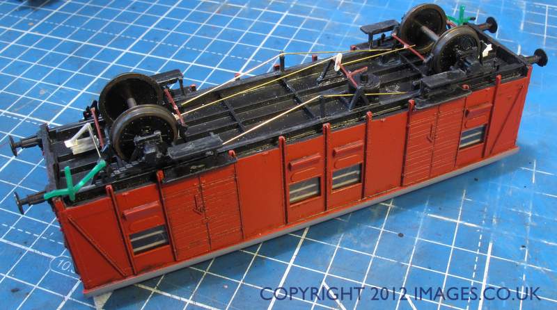 One of the challenges of using kits today is making them ‘work’ amongst the better quality ready to run models. This is particularly true of older kits in some of the ranges. The key thing that stood out for me on this van was the chassis looked very bare underneath. When viewing Albion Yard, the viewpoint is almost eyelevel, so missing brake gear does show up, particularly if other vehicles have it. I used Paul Bartletts site (see below) to get an idea of how the brake gear mechanism would appear. I then used scraps of wire and plasticard seen above to make a representation of the equipment. Once painted the basic nature of the detailing disappears, and is less noticeable when the vehicle is on the layout.