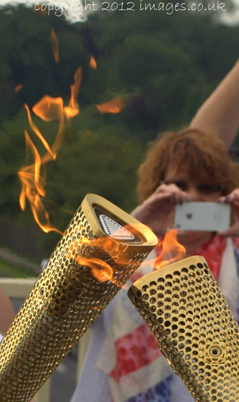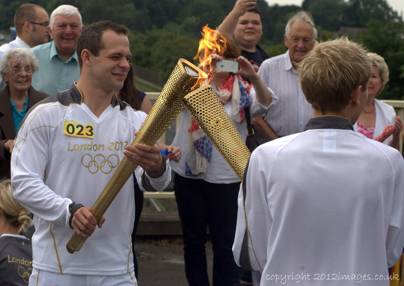 Ben Gibbons, lights the Olympic Torch for Jason Hazard (023) above the A1 in Tuxford, Nottinghamshire