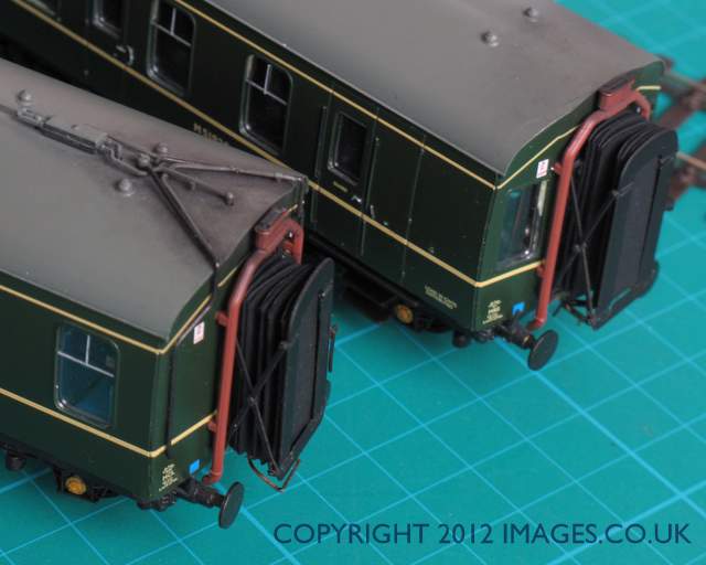 As I’d found a couple of Slaters scissors corridor connection kits in my pile of ‘to do’ stuff I thought I’d use them for the Derby lightweight. (These were items I’d bought in the 80’s for use on a Lima 117 DMU makeover, but never got round to using). A wonderful plan apart from once I’d removed the endplates from the etches, the endplates and scissors as seen above, were too wide to fit between the Derby’s exhausts. So I now had two DMU’s that wouldn’t work for me, the Derby still had too wide a gap between the corridor ends, and the 108 that whilst close coupled still niggled as not being quite right, there being a visible gap between corridor ends.