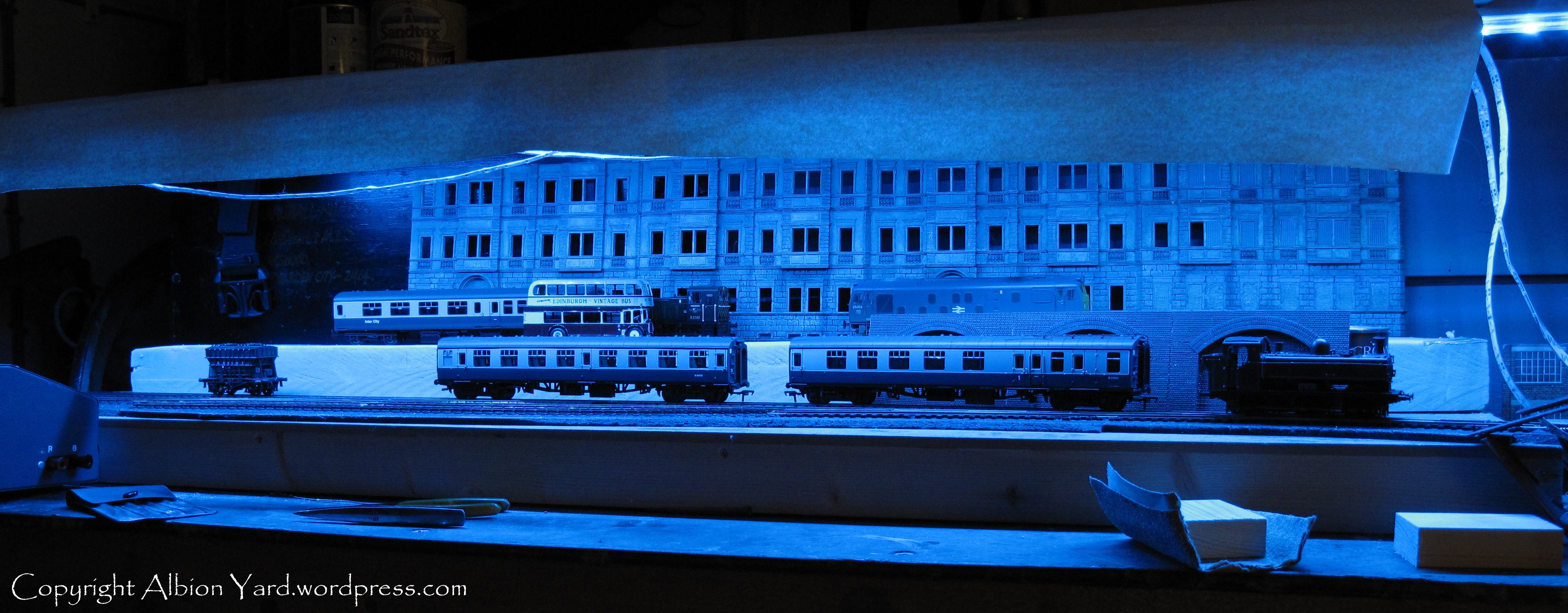I’d got off to a flyer initially but then I got more disilusioned as I realised what I was making didn’t ‘work’. The above shot gives an idea of the ‘failed’ design, even playing with different lighting effects made no difference. The visual/plausible and practical factors were all conflicting, because what I was making was unrealistic. When you realise this its time to bite the bullet and get back to basics, and redesign/plan/build. Many dont do this and undoubtedly thats the reason for any number of stalled projects, uncompleted layouts, and poorly finished examples that are around, you’ve got to be in it to win it! For me this meant pretty much starting again, but with the same track plan and area. What I’ve made in its place has suddenly come together over the last week or so, which with filming at the end of the month is cutting it very fine. But at least my ‘Shelfie’ now works, in all senses!
