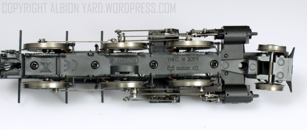 It’s a difficult call to make sometimes when a fault like this is apparent. Firstly there’s no question it shouldn’t be there. Technically it is a faulty product, and consumer protection rights in the UK direct you back to the retailer/vendor for resolution if you are so minded. However like a good number of my friends I will tend to take a pragmatic approach, firstly thinking can I live with it, if not can I fix it?, and how easy is it to fix? This issue appears to be fixable, and there’s value I feel, in the extended review to try and do that, and I’m a modeller, it’s what I do. So long as at the end I haven’t got a little pile of screws, nuts and wires left over, I’ll be happy. The valve gear and connecting rods are well proportioned bearing in mind the model requires a degree of robustness to allow it to be handled normally and the running qualities of both my examples are excellent, virtually silent and smooth with no evidence of cogging or quartering issues even at very slow speeds. Pickup is from both locomotive and tender, you do need both connected, this also ensure electrical continuity across dead frog turnouts greatly reducing the chances of the engine stalling. The driving wheels are well represented, the prototype having quite a large boss at the axle end. The pony truck wheels too look good, for me they’ll be replaced if possible with Alan Gibson when time permits. Wheel tyres are a dull steel colour matching the spokes and hubs well giving a subdued and ex works type of appearance. No traction tyres are fitted and the performance of the model is perfectly acceptable without them. The motor and gear train are all enclosed and helping the running is a brass flywheel.