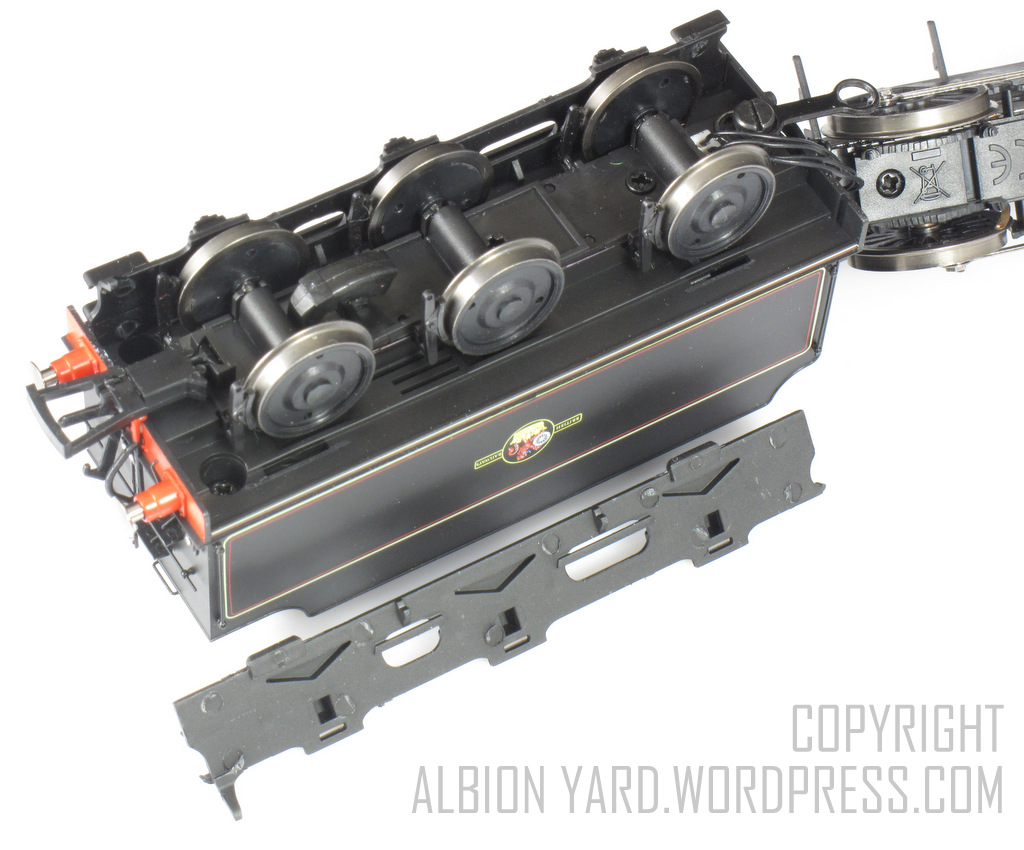 The locomotive and tender are semi permanently coupled. There are pickups within the tender chassis the electrical connection being via a discreet wiring loom between loco and tender. A nice touch is that Hornby have designed a coupling that allows you to close couple the locomotive and tender with a simple screw adjustment. On the close coupling setting my examples work fine through Peco Streamline medium radius turnouts.