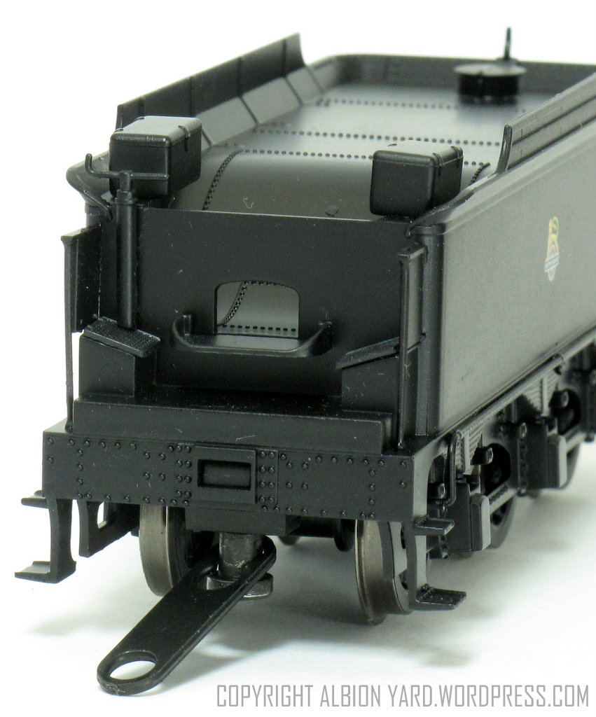 Fitting DCC sound to this model will be a bit of a challenge. Unlike the J15 and K1 tender there is no pre engineered facility to fit a speaker. The underneath of the tender water tank has metal weights held in position by screws, these will need to be removed to fit a speaker and an aperture/s made to allow sound to escape. A sugar cube speaker looks the most likely solution with a locomotive chip within the water space of the tender. Brake pull rods are supplied for the tender, and brake shoes are in line with the wheelsets (as they are on the engine). One tender wheelset was stiff and skidded on occasion which turned out to be a poorly adjusted pick up.