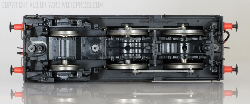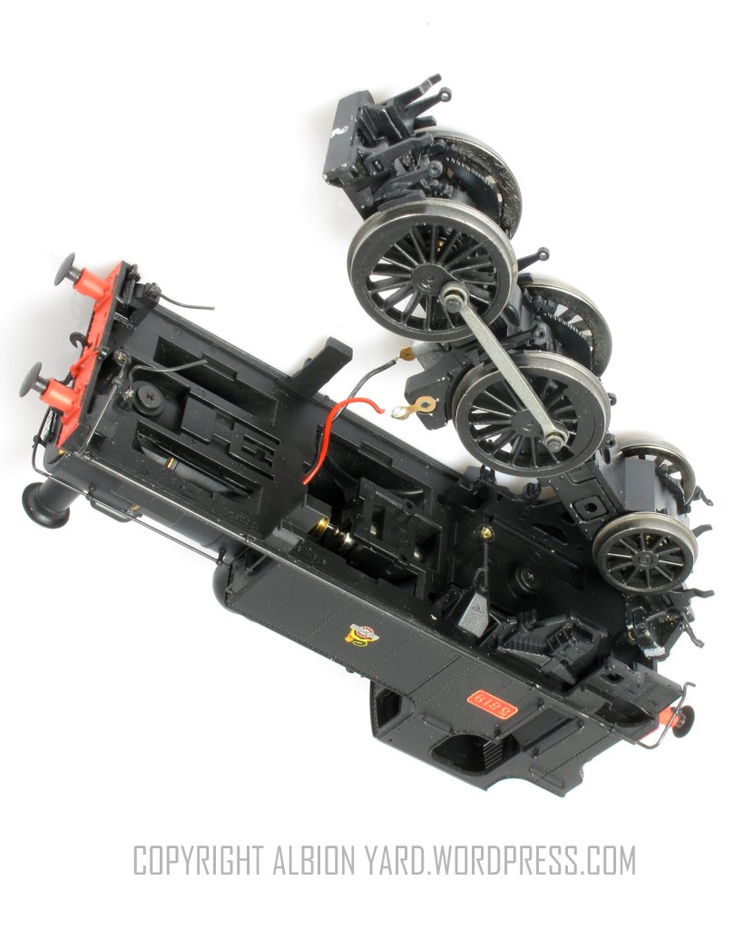 The loco is effectively a rigid O.6.O with only two wheels driven and the suggestion of driving the trailing wheels would work, especially had the ashpan been included to hide the gear train, Unfortunately there is a large screw exactly where the gears would go. The loco only needs as much sideways play as for e.g. a 57xx as the overall wheelbase is the same so I am not quite sure why there is so much on this model. The design has been compromised by having so little mass at the front end. It should, in my opinion, have had a diecast smokebox/boiler unit to the front of the firebox with Dave Jones’ favourite Tungsten ballast weight from the front as far back as the mechanism. Surely there is enough room in the sidetanks for DCC and sound fittings??