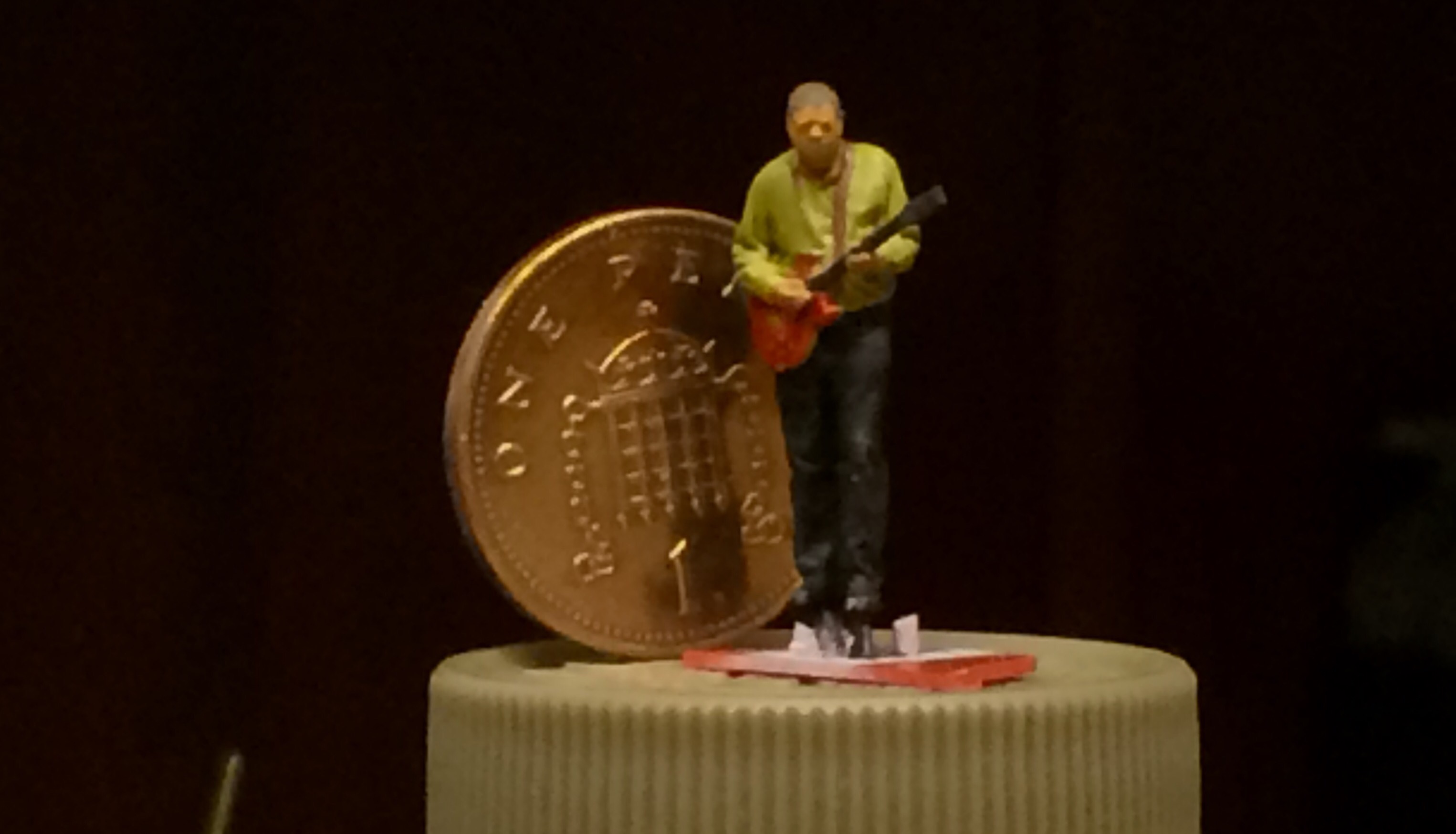 This was the opening screen that met us, and we both were thinking we recognise that building, and then the penny dropped, this is a signal box on Pendon Museum’ s Vale scene. That came as a surprise, but not quite as much as the rest of the programme provided. The figures have been used throughout the documentary, we thought we’d get thirty seconds or so, but throughout the seventy minute show the figures appear, as does the Museum at Pendon. After the showing it was very pleasing to be asked about the figures and their production by both band members and the TV company staff who thought both Pendon and the figures/modelmaking were intriguing and interesting.