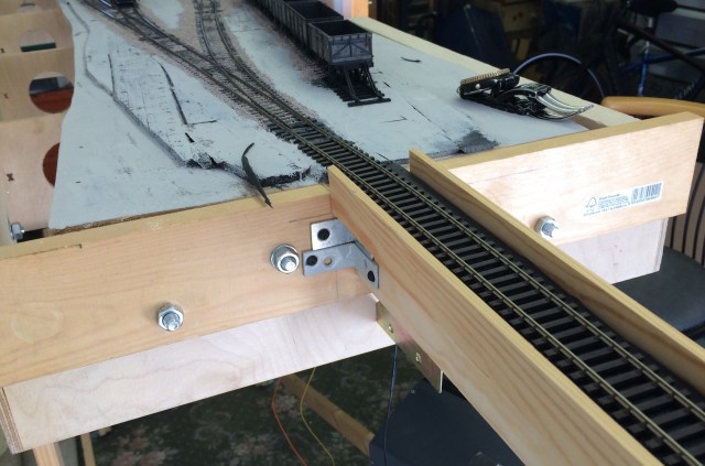 And that’s quite right, partly as I’ve not yet worked out how my fiddle yard will work. One thing I (probably) don’t want, is another baseboard with wasted space on it. I follow a few blogs and recently Rick de Candido has been writing about staging and storage yards on his fillmore avenue roundhouse blog. Iain Rice has also covered many types of fiddle yard variations in his writings and as you can see from the attached images, I’ve knocked together a ‘flying fiddle yard’ (or ‘stick’ more accurately), to give it a try. Firstly and simply it works. I do need a better support system for it and if you’re not looking you can forget its there and walk into it, ask my daughter, she knows! As the scenery structure is now well developed the staging is coming into a higher priority.