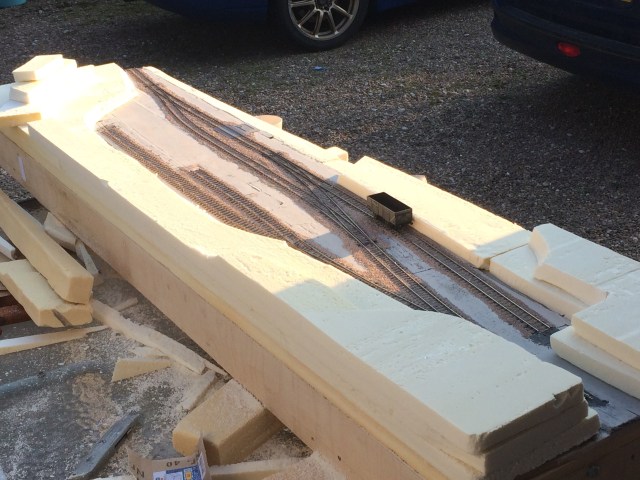 So the simple scenery structure build has taken place. This is building insulation foam with the fireproof cladding stripped off. This is done so that I can stick the layers together using a hot glue gun. PVA’s etc wont cure and simply absorb into the foam core. It does give a very easy structure which can be easily carved to get the overall outline required. I use an old hacksaw blade and a rough sandpaper to profile the contours. The idea evolved into a drift colliery collection point, similar to that at Parkend in the Forest of Dean. I wanted to make sure I was viewing and operating the layout from the right side, sounds odd, but go with the flow for a second!