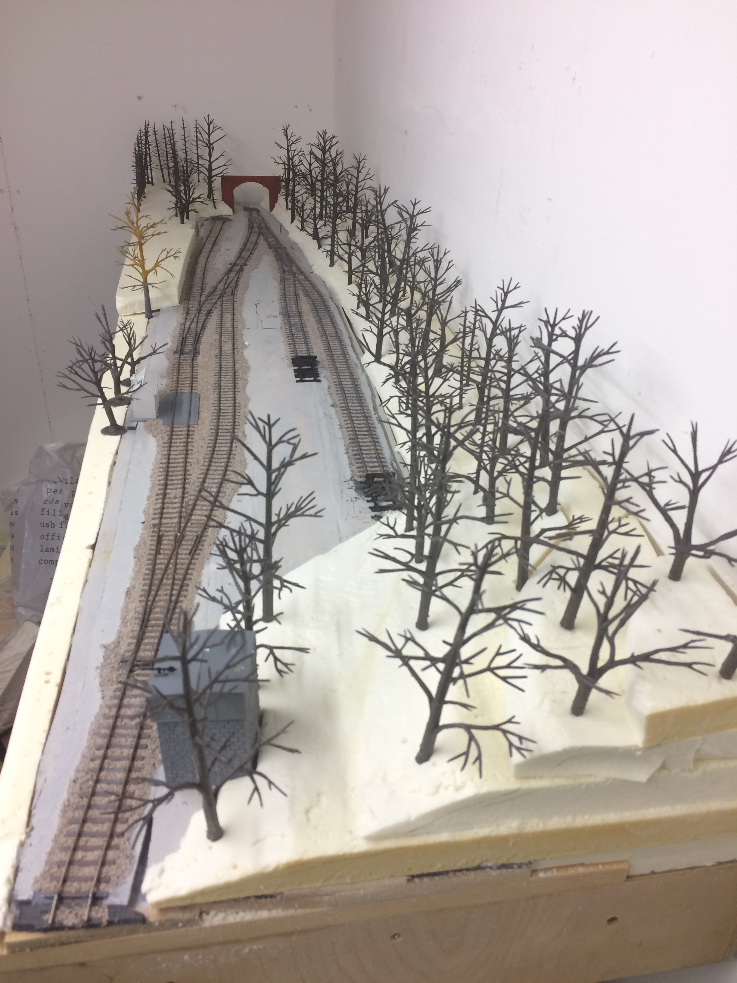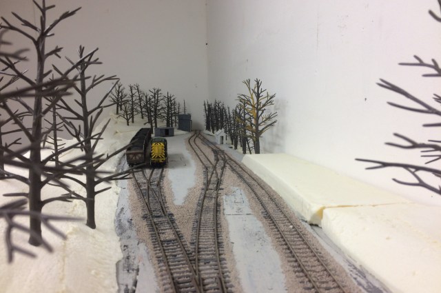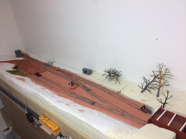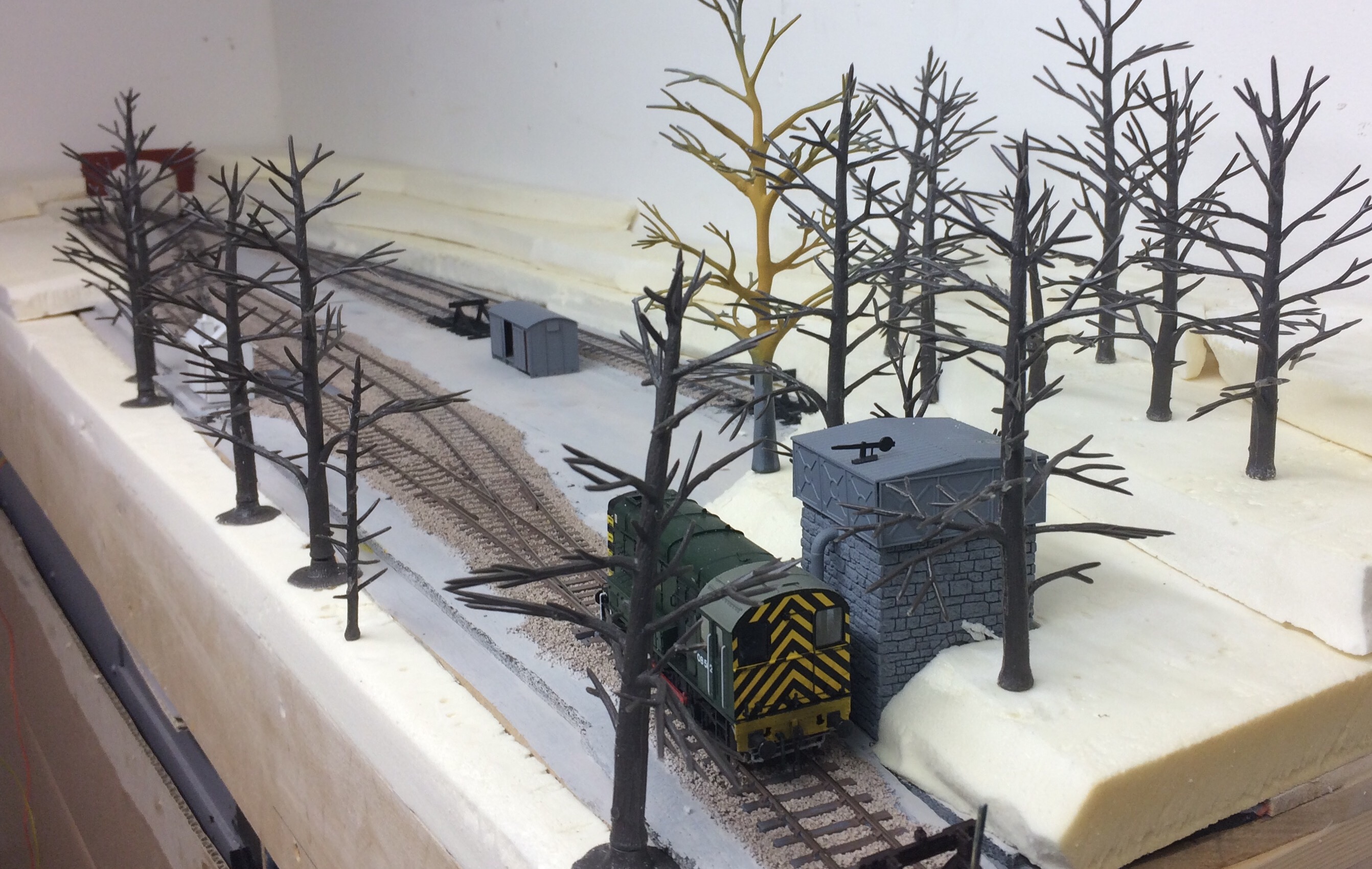 The tree armatures are Woodland Scenics, and using them has helped visualise the impact of setting this small yard in a woodland area. I really like the view from the siding rather than the loop side but this has two disadvantages. The embankment doesn’t help with the three link couplings combined with trees, a combination that’ll get me shot the first post beer Sunday morning from my fellow exhibition operating team, and less importantly the backscene will be too close to the loading dock in particular, to effectively make a transition from model to backdrop.