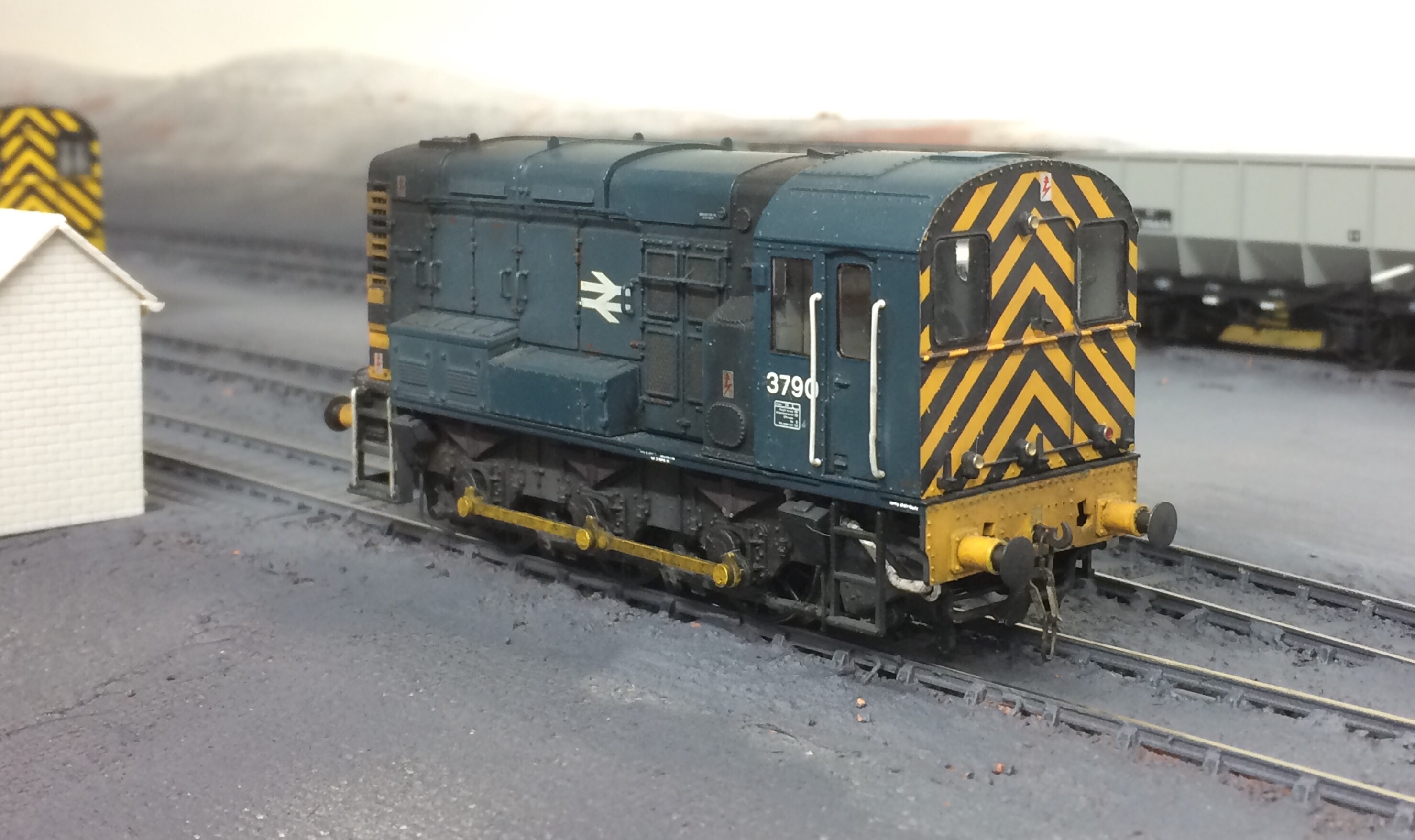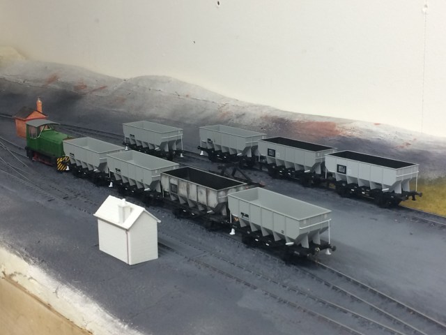 The difference in the technique I made was to use a hair dryer to dry the surface, this then seems to allow the remaining moisture to wick to the upper surface. I did this two or three times and the clay had dried within two days. With the clay dry I painted the surface. This is done with Halfords spray paints, Matt black initially then followed by their grey undercoat. To give a further tonal variation Tamiya gunship grey was added before the rails were coloured with a mix of earth and NATO brown. The last image shows the basic black and grey toning and the subtle variations you can achieve with just three colours from spray cans, and prior to rail painting. The key to this for me is working quickly and not getting too bogged down in the detail, for example the track had only been painted because it had been recycled, had it not gone through the earlier iterations I’d have painted the track in its ‘raw’ state. Cleaning of the rail heads does take a bit of time and effort, I use Cellulose thinners on cotton buds which removes the layers instantly and pay particular attention around the point switch blades to ensure good electrical contact. When doing this make sure that the inner side of the railhead gets cleaned too, this significantly helping with power collection. Don’t forget to look at the layout from the height you’ll operate it at too, you’d be surprised at where paint gets, and more importantly doesn’t get! This then makes sure the running is of good quality, I find that for a week or so after the paint and clay application the rails need cleaning frequently, I assume that this is partly due to a sort of microclimate as the last vestiges of moisture are released from the clay and paint. It’s now about two weeks since the paint and clay and track cleaning is regular but not a pre running essential. On the subject of running, behind the 08 you can see some of the Hornby 21T LNER Dia100 hoppers. Lovely wagons but generally if my batch are anything to go by, appalling runners. I’ve worked out a quick fix for them which I’ll cover in a separate post soon.