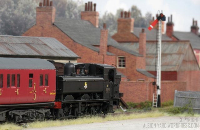 Whilst working up some words for a magazine piece, I was searching through the back catalogue of images of the layout and found this one out, a staged shot with passenger traffic and signalling at Albion Yard. It’s one of the Bachmann 64xx’s Pannier Capers 64xx that I picked up to add a bit of variety to the fleet. It’s shown with a Ratio modified LNWR signal, Ratio posts and MSE arm and details, and a B-Set from the late Geoff Brewin’s collection. I’ve recently added a further 64xx in to the mix and have yet to choose between a conversion to a 74xx, or go a significant stage further and fit the High Level kits 54xx chassis kit. Choices eh?