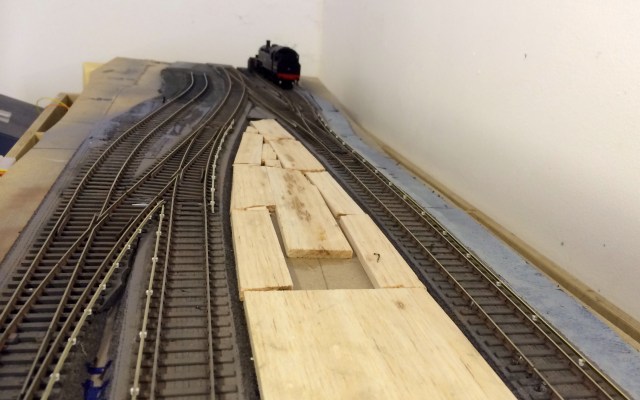 Swing the camera through 180 degrees to look at the old station throat, and the new loading bank is now underway, based on a couple of similar installations in the Forest of Dean, Parkend, being one of them. I’m keeping my options open to possibly integrate this layout into a larger Forest of Dean project, as either a drift mine or Ballast railhead.