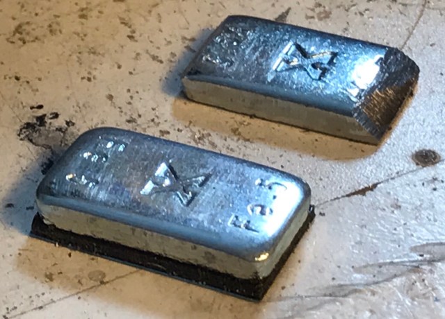 So this is the fifteen minute bit! The nearest weight above is unmodified, the one at the back is adapted to fit as discretely as possible. Being a mild steel the weights file relatively easily so the first job is to remove the adhesive backing, this reduces their thickness as I’m using superglue to keep them in place instead.