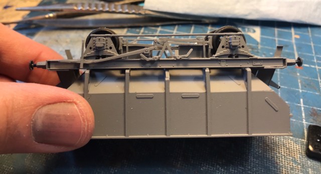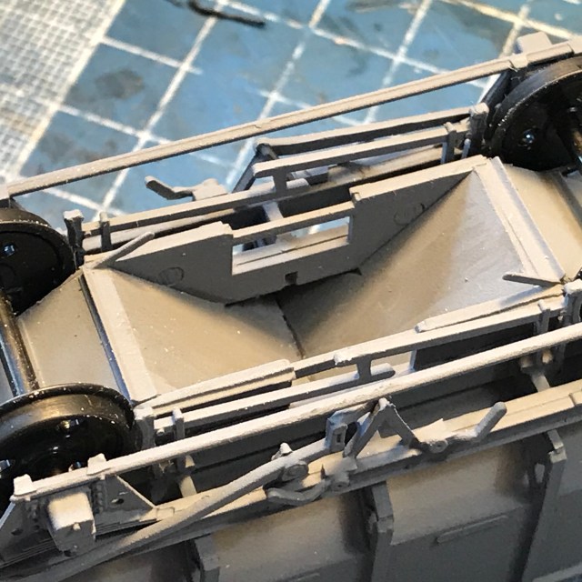So, here they are test fitted, once filed back they are almost invisible from the side. The 45 degree chamfer makes better use of space at the depth of the hopper valley, and reduces the visible section protruding when the wagon is the right way up.