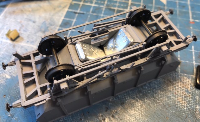 I’ve got a few of Hornby’s excellent 21 ton hoppers, and to ring the changes a small batch of Accurascale 24.5 ton hoppers. So where’s the fifteen minutes? Well, as well as buying RTR wagons I’ve a few of the Parkside BR PC77 21 ton hoppers (dia1/146) to complete, these will be run as individual wagons rather than fixed rakes. The thing is, these kits are very light, the other hoppers aren’t exactly pie eaters either, but I do want to add weight to the kit versions.