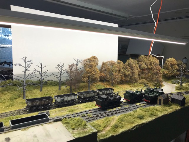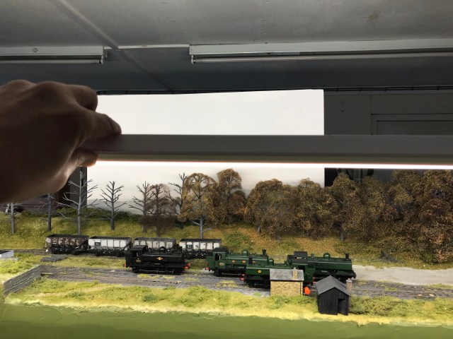 Having got the coupling issue resolved that gives me further opportunities in the scenic display. If we don’t need the hand of god getting in the way, or me or the team blundering around in front of the train set, then I can potentially do more scenic stuff front of house. So I’m now getting the lighting rig together with a bit of a yippee moment earlier today. The display is view and operate from the front, and like Shelfie1 a wraparound backscene. I’ve changed to LED strip lighting of 4000k and you can see the first trials here.