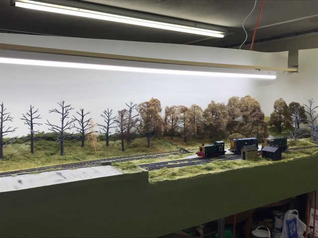 One thing I need to hide is the shadows thrown on the backdrop by the foreground trees, this was tested and a single downlight batten will run almost full length at the rear, to try this I rigged up lining paper along the rear of the layout.