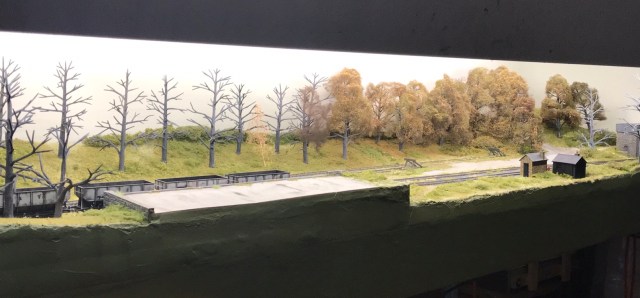 This is the effect Albion Yard used, the blue in Albion’s backdrop bounced cool tones back into the layout. This time I’m using 4000k LED battens, rather than Albion’s traditional fluorescent tubes. The idea here will be to try an overcast sky, heralding an imminent rain shower. So the skies tonal value will be emphasised towards cool greys. I need to play around a bit more with the colours as I want a diffused distant tree covered hill line, which will require opposing warm brown tones for this time of year.