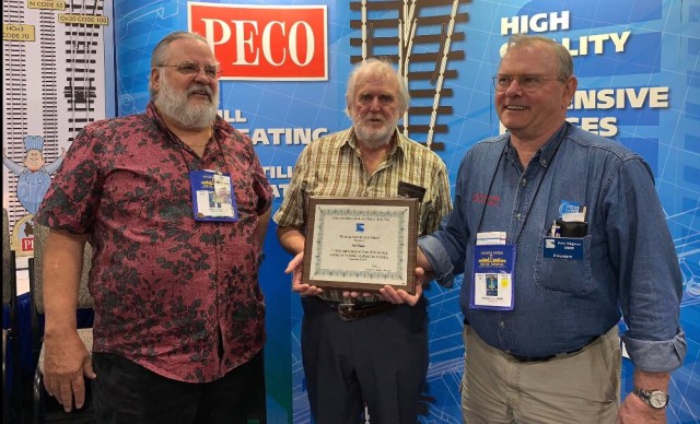 Bob Phelps receives the NMRA’s distinguished service award Saturday 13th July 2019 from NMRA President Pete Magoun, at the NMRA National Train Show in Utah.