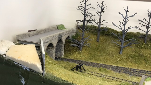 As you can see here in the initial build the density of the lower foliage next to the bridge was far too great. However I’d put some coverage of leaves and paint across it which masked the problem due to it looking ‘completed’. After a few days it was annoying me so much that I removed all the foliage to have another go leaving a pretty bare look, something like this.