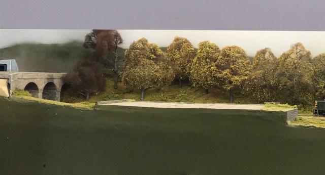 I did try out a ‘tunnel’ of trees, with no bridge, but due to the short length of the cutting, I couldn’t get a long enough run under cover of the trees to show that canopy effectively before running through the backscene. So it was back to building a see through Autumn feel for the tree diffuser line.