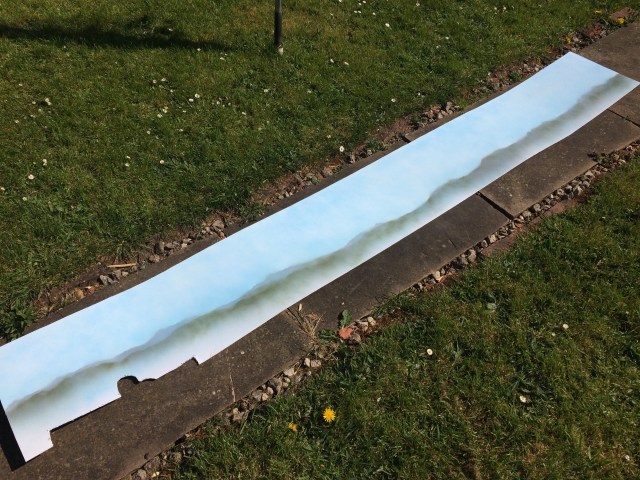 Today’s one of the milestones in getting Shelfie2 completed. With little breeze and good drying weather it was time to get the backscene completed. Using a technique suggested and highly effectively used by Chris Nevard, it was time to dig out the spray paints. I’d previously painted the sky and used paper cut outs as below to establish a horizon.