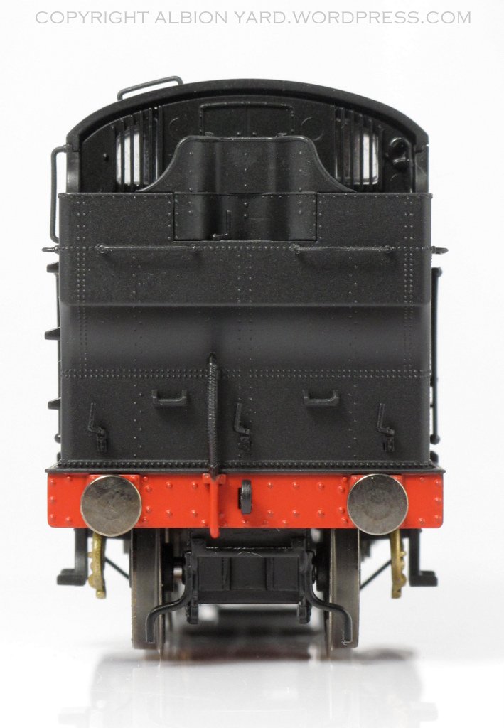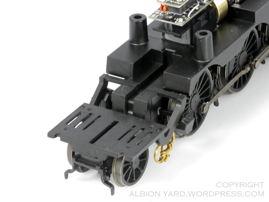 The superstructure is dimensionally correct, cross checked against measurements from a couple of sources, the neatly moulded plastic body with joint lines all discreet. Two parallel lines are faintly noticeable under the strongest of natural or photographic light along the boiler top from the smoke box to the tank front. The prominent boiler band and tank strap was sitting slightly proud of the boiler by a few thousandths of an inch. A touch of glue will sit it tightly to the boiler outer face. The front steps are splayed outwards, whereas prototypes are angled inwards. This is clearly to give adequate clearance to the leading pony truck. It isn’t immediately obvious and the subterfuge largely works.