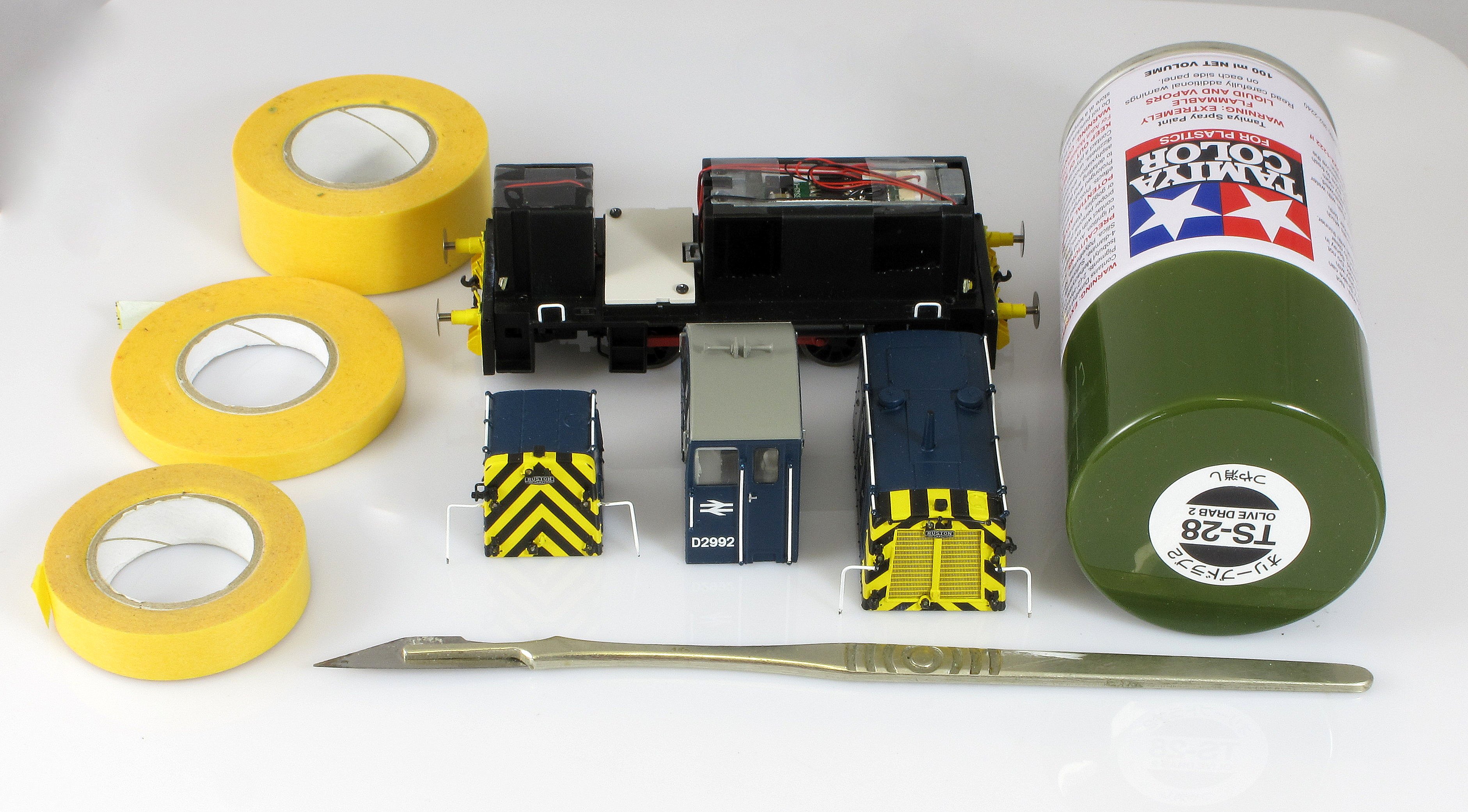I chose a simple plain green livery for the new colour, as that would be a common choice, often locomotives were left in their previous liveries and identifying marks changed. For practicality and simplicity the brief was to use spray cans, not everyone has access to airbrushes, and using an aerosol we can reduce paint blemishes such as brush marks. Knowing the general ease of getting the Tamiya range I chose their Olive Drab 2 TS28 colour. The Tamiya range is acrylic and very high quality, so we could be sure this wouldn’t affect the plastic of the model to any detriment. Other items in the shopping basket were a couple of different width Tamiya masking tapes, and some new blades for my scalpel for cutting tape. As far as other tools go, I use a Tamiya paint stand and a straight edge steel rule, and that’s us ready to go!
