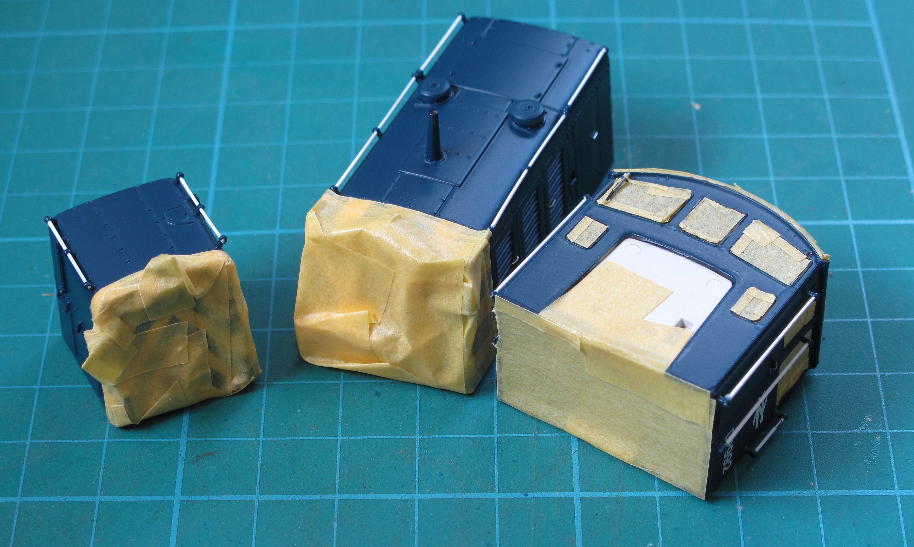 The first thing to do is decide what will be painted, I chose to leave the wasp markings on the ends and the chassis as supplied. The best way to paint something like this is in sub-assemblies and fortunately the Heljan 07 is easy to take apart. As written in the instructions underneath the body at each corner of the chassis, there are four crosshead screws, undo these and the body assemblies can be gently lifted off the chassis. The footplate handrails can also be removed from the long and short bonnet sections, this will make masking and painting much easier.