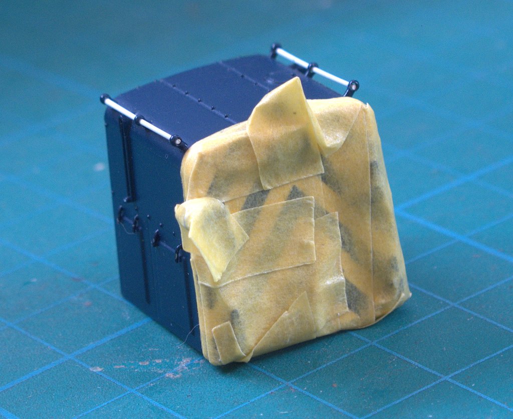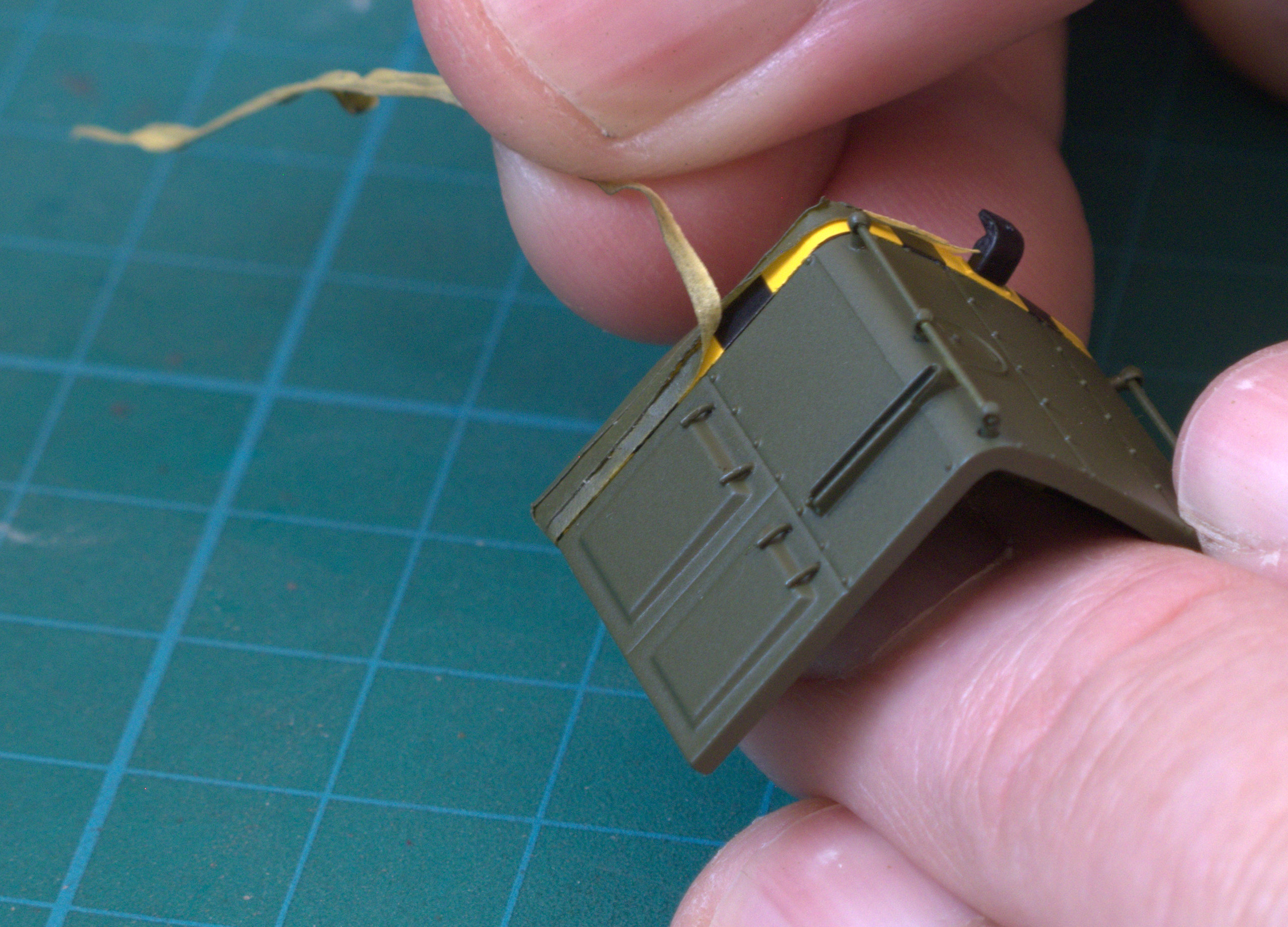 These are the three sections ready for paint. Double check that all areas are covered that need to be and the sedges are sharp and well pressed onto the model. Note the underneath of the cab has also been masked to prevent paint reaching into the cab. The checking is crucial it will save heartache later if edges aren’t sharp and paint bleeds or feathers underneath.