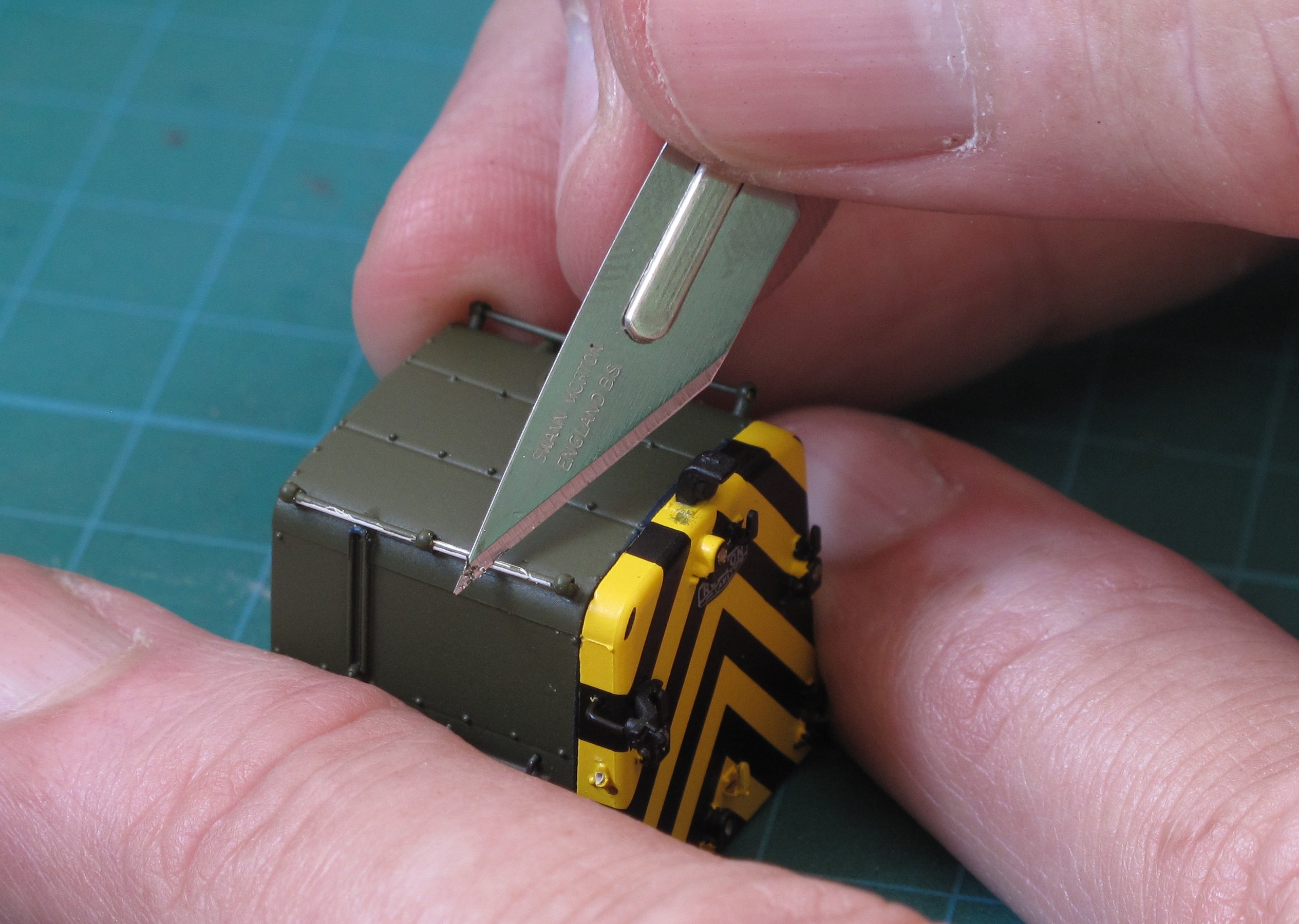 New Identity. I’ve used a mix of waterslide decals from my unused spares box, I’ve chosen Southern Railway O gauge wagon numbers for the locomotive number, and a couple of 1/72 data panels from an old P51 Mustang sheet. It’s freelance so it doesn’t matter and you can stamp your own identity on the model. I placed numbers on the bufferbeams too, giving a company style type of look. To finish I added overhead warning panels around doors and step areas. I’ve used microsol setting solution to unsure the decals seat correctly with no silvering, this paint gives a satin sheen which also helps with the decal adhesion.