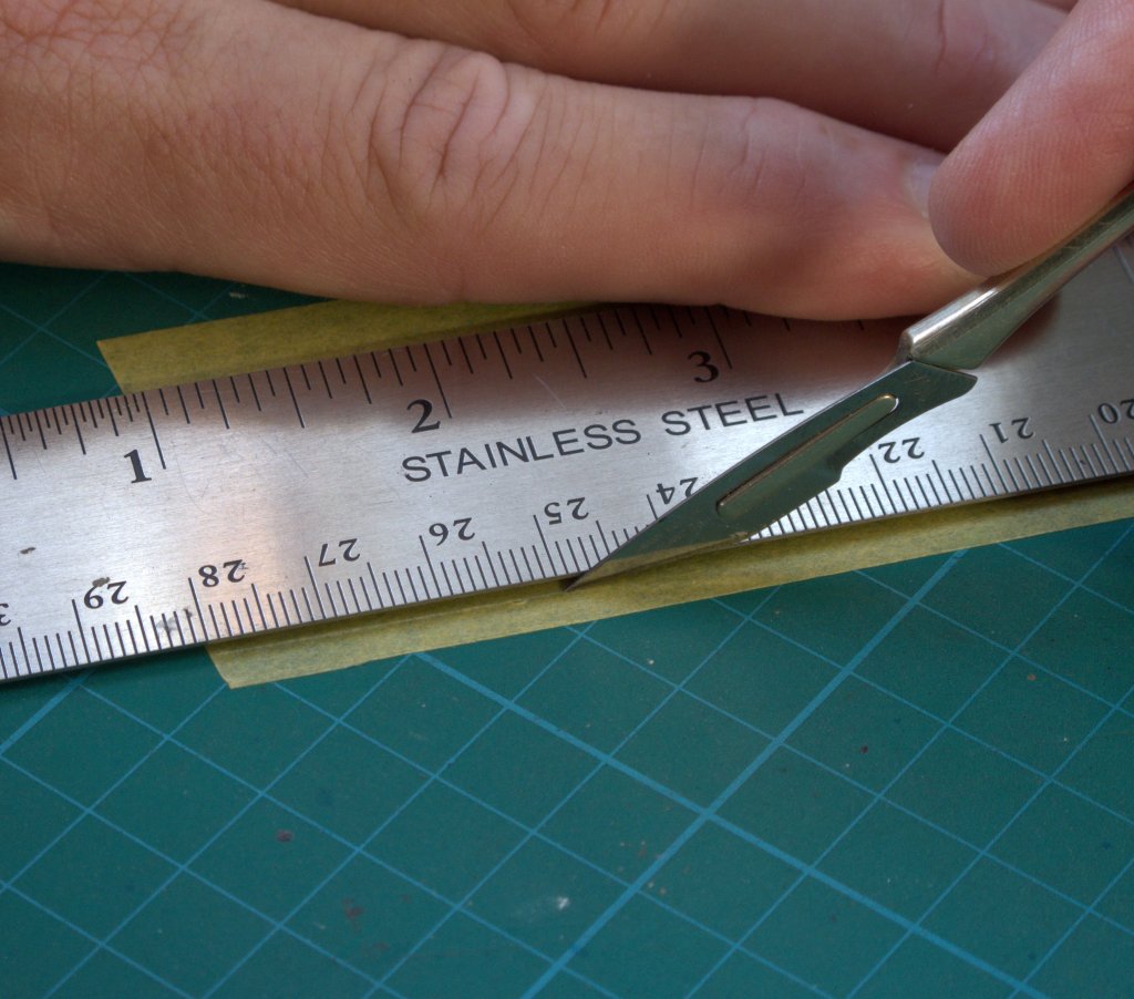 The Tamiya masking tape is low tack and can be cut easily. Make several narrow strips of tape as these can be formed around the curves easier. It is critical to have a straight edge and sharp blades, to prevent any feathering at the edge of the tape. Make several different widths, and lengths, some longer than you’ll need, and some very short sections.
