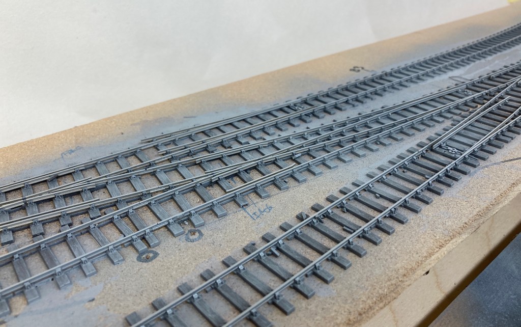 The points are Peco SL-U1188 and SL-U1189 unifrog type with actuation including frog switching via Tortoise switch motors. This means there’s far less reliance on the physical point blades to conduct electrical power. If you’re using a ‘traditional’ insulated type of frog then you ideally need to mask the contact points of the blades and stock rails before painting.