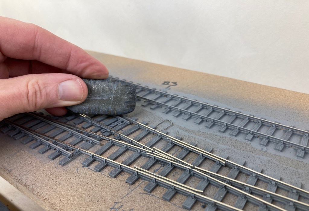 It’s not a direct match to the rail head coloring but does hide the black plastic. Further paint detailing such as the fishplates and point rodding will be done on completion of ballasting and point control fitting.