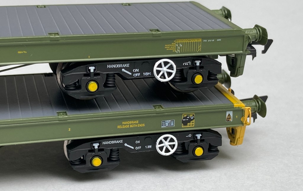 One thing of note was the side play of the tension lock hooks in the actual coupling, I felt this was a little too loose however I didn’t experience any problems myself but if used on set track its something to keep an eye on. The livery of the buffer beams is the major noticeable difference between the two models. On my sample the yellow wasn’t quite as opaque as I’d have preferred, however with weathering applied that won’t be an issue, and I’d rather it be that way than have the paint too thick and obscuring detail. Individual lamp irons are applied and there’s one hole for the air pipes supplied as additional details. If representing an earlier wagon with dual brake pipework, it will be up to the purchaser to source and fit the additional pipes for the buffer beams. The wagons were ‘through’ piped for vacuum work and would have run with a brake van attached to provide braking power.
