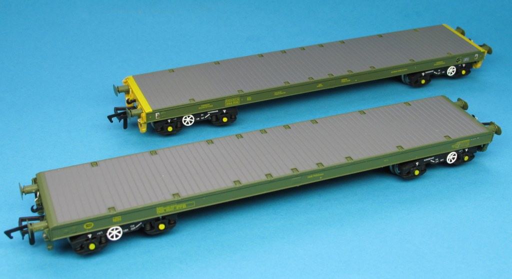 The KFA then is the model I’ll start with, this is in the later livery with the yellow end stocks. The whole body moulding is very cleanly moulded with no apparent tooling slide lines anywhere. Top deck planks are well defined with cutaways for fixing shackles or tie down straps to wagon tie down locations. The end of each wagon has a subtle grip pattern on the tops of the buffer beams. All edges are sharp and on the side beams the wagon label clip for paperwork is well defined.