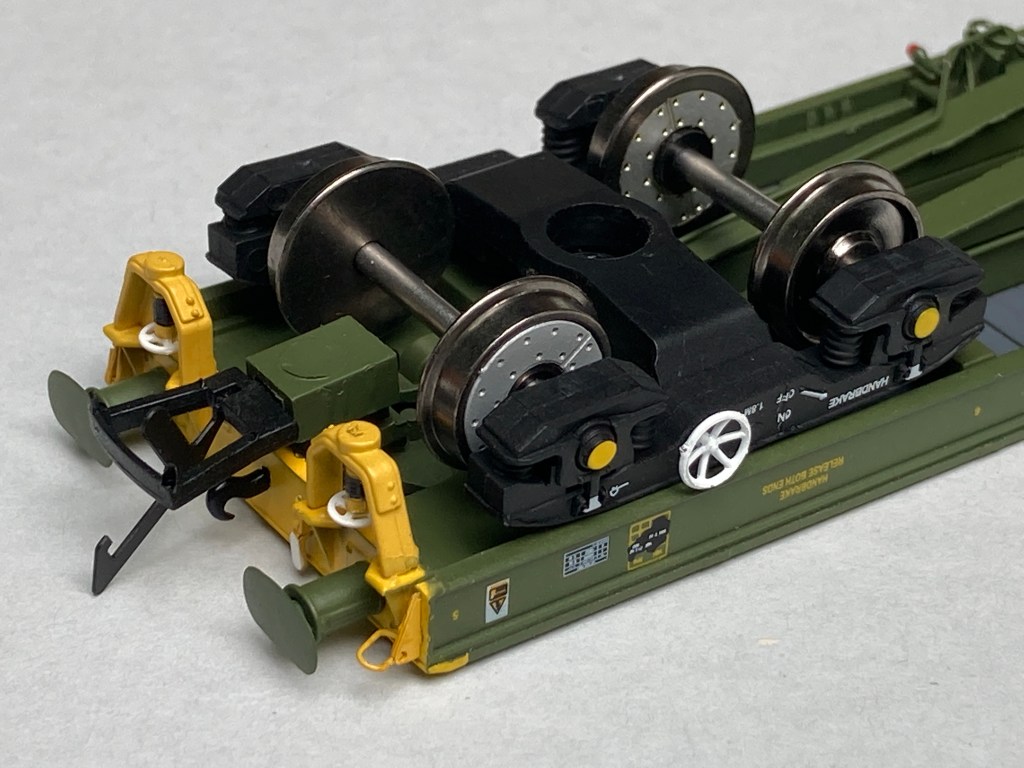 The packaging for them is simple and robust. A stiff outer carton and moulded ‘ice cube’ inner tray with close fitting lid holds the wagons securely including the detail pack of air hoses. all appear to be recyclable. With the first look at the wagons they are well assembled with no loose parts the paint and livery The wagons weigh in at 91grams each, the deck being a plastic moulding and the spinal frame underneath of metal. Looking at the running gear, wheels and axles are metal on 26mm standard axles housed in plastic bogies.