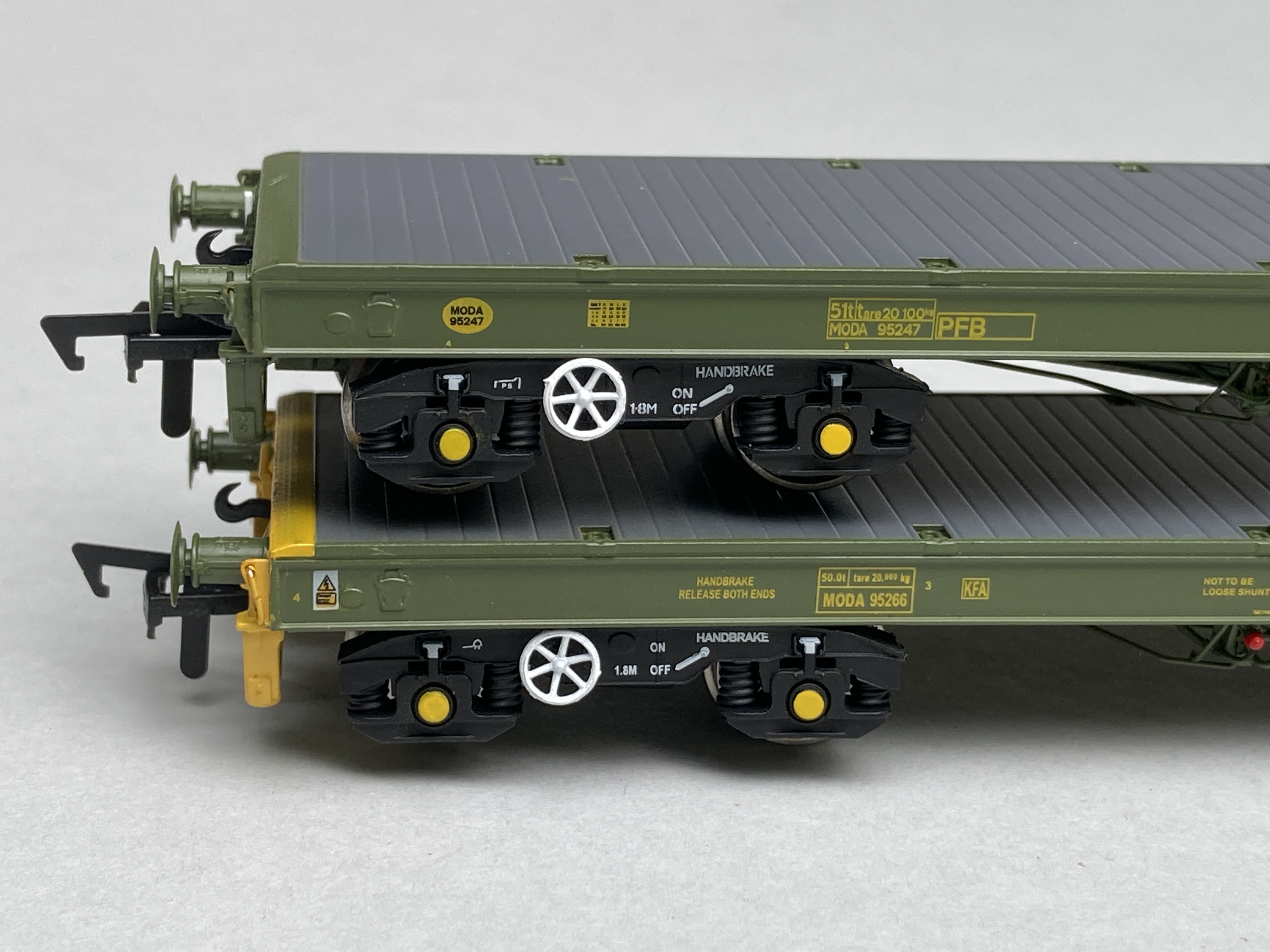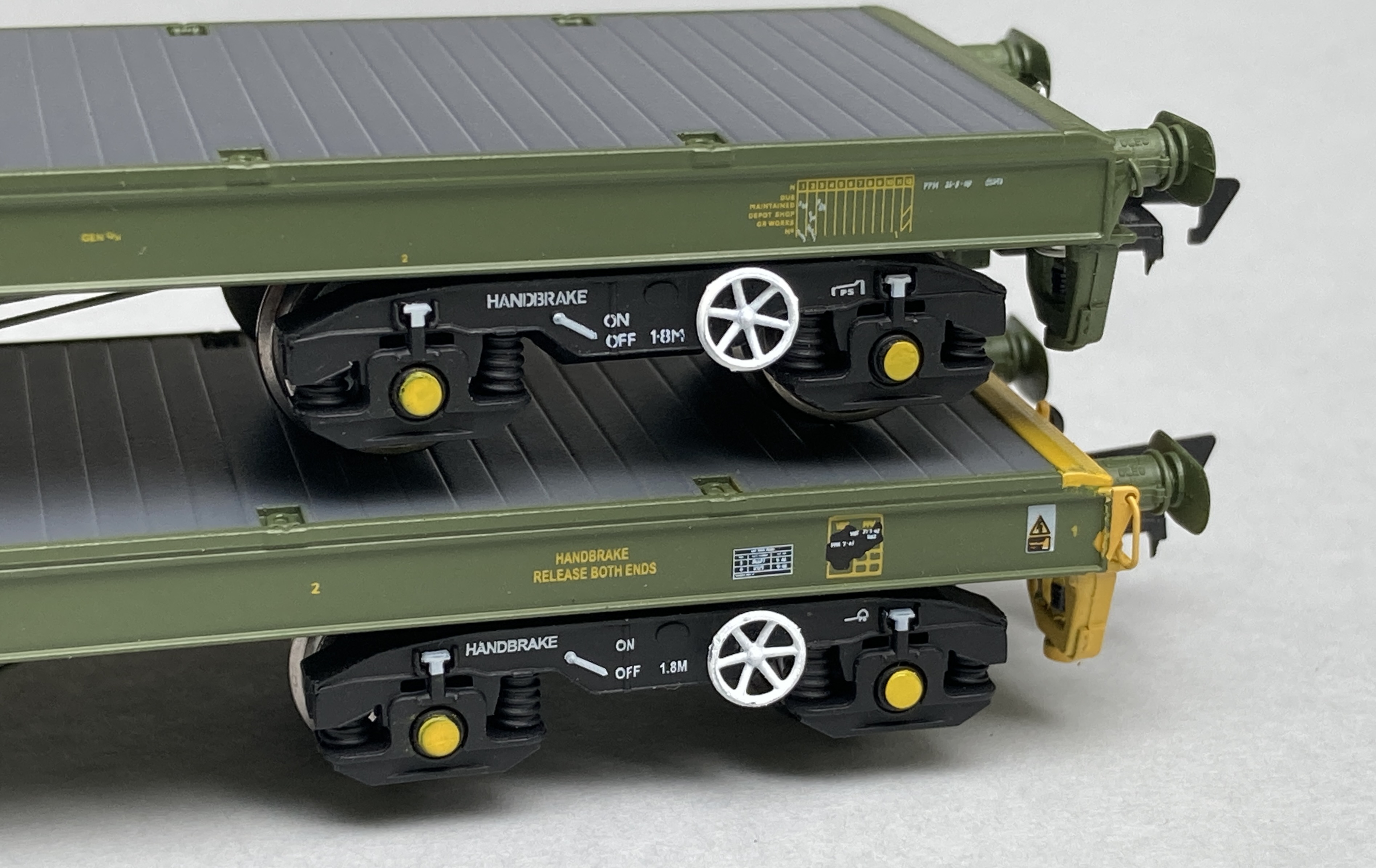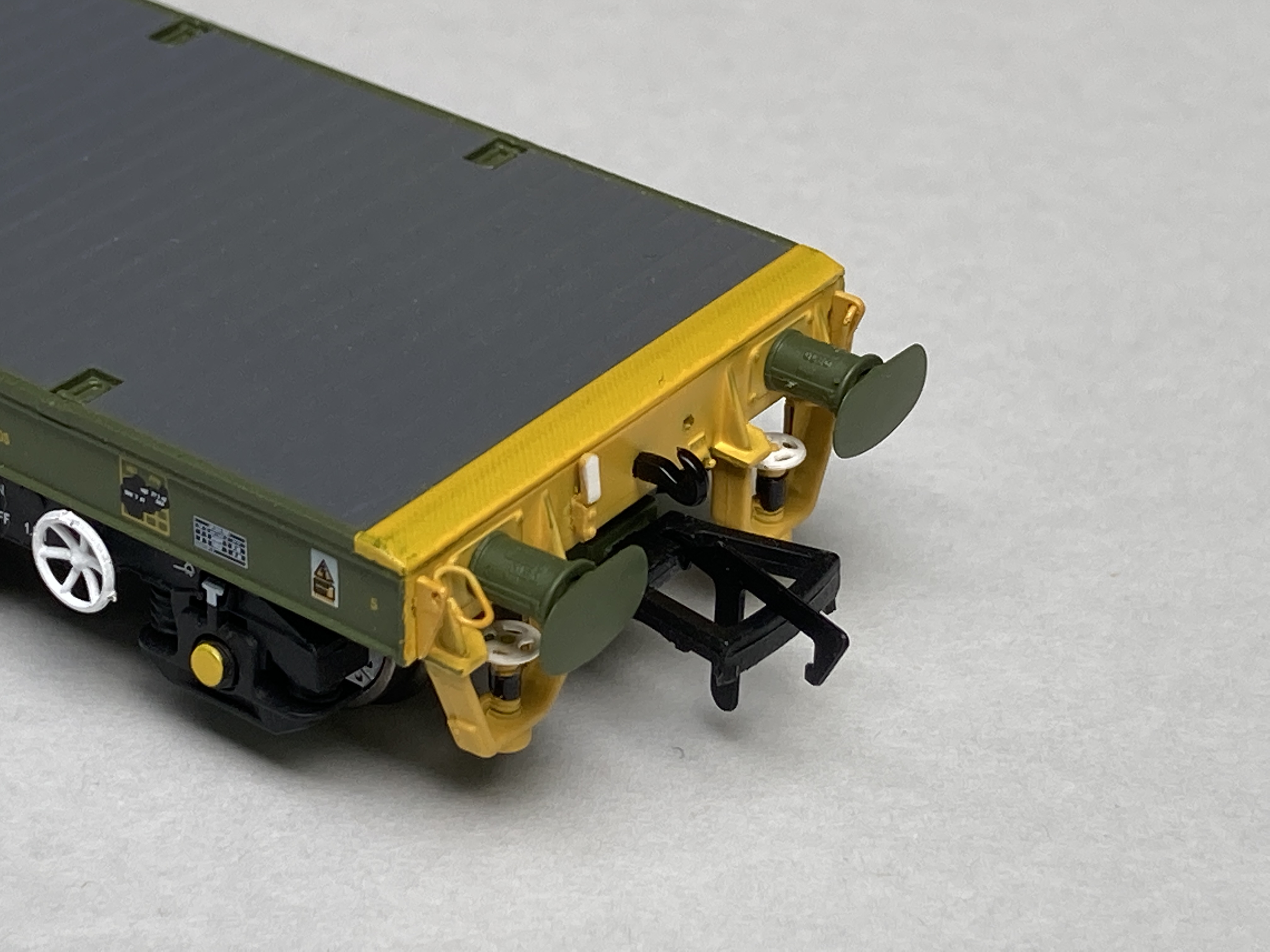The KFA then is the model I’ll start with, this is in the later livery with the yellow end stocks. The whole body moulding is very cleanly moulded with no apparent tooling slide lines anywhere. Top deck planks are well defined with cutaways for fixing shackles or tie down straps to wagon tie down locations. The end of each wagon has a subtle grip pattern on the tops of the buffer beams. All edges are sharp and on the side beams the wagon label clip for paperwork is well defined.