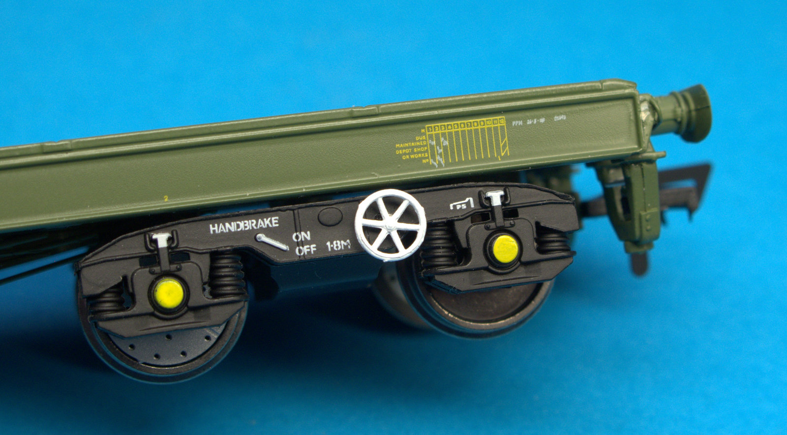 The buffer beams are a notable area of detail, the buffers are sprung, with oval heads. These types of buffer are often left with the ability to rotate on RTR products, but these are kept horizontal and have a commendably thin head to them. Outer edges of the beams have individual loops for tie down and chain fixings which I was very impressed with. Screw jacks are fitted to the underneath of the buffer beam and are fitted with the appropriate hand wheel and modelled in the raised position. They are correctly situated so they’d align with scale gauge track rather than OO but the difference isn’t particularly notable. These do show a mould line on the side of them but you do have to be very close to notice it.