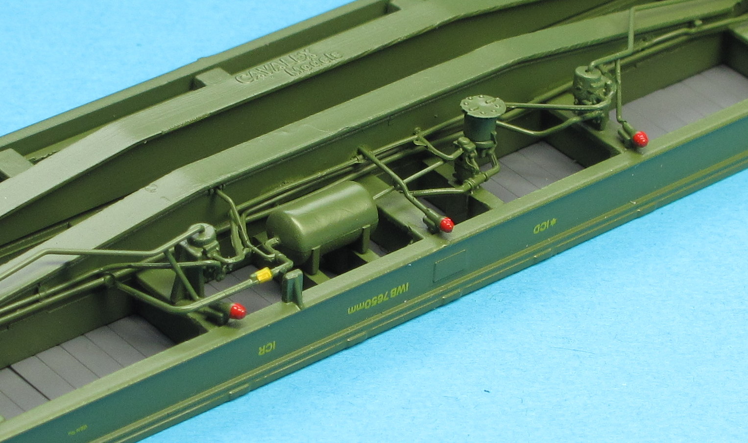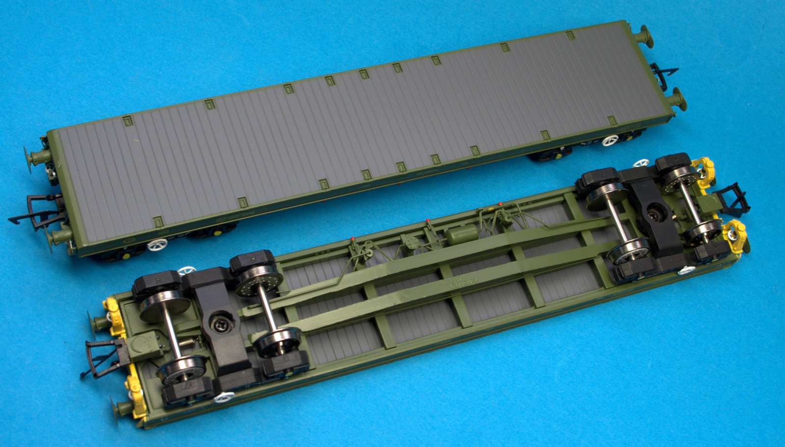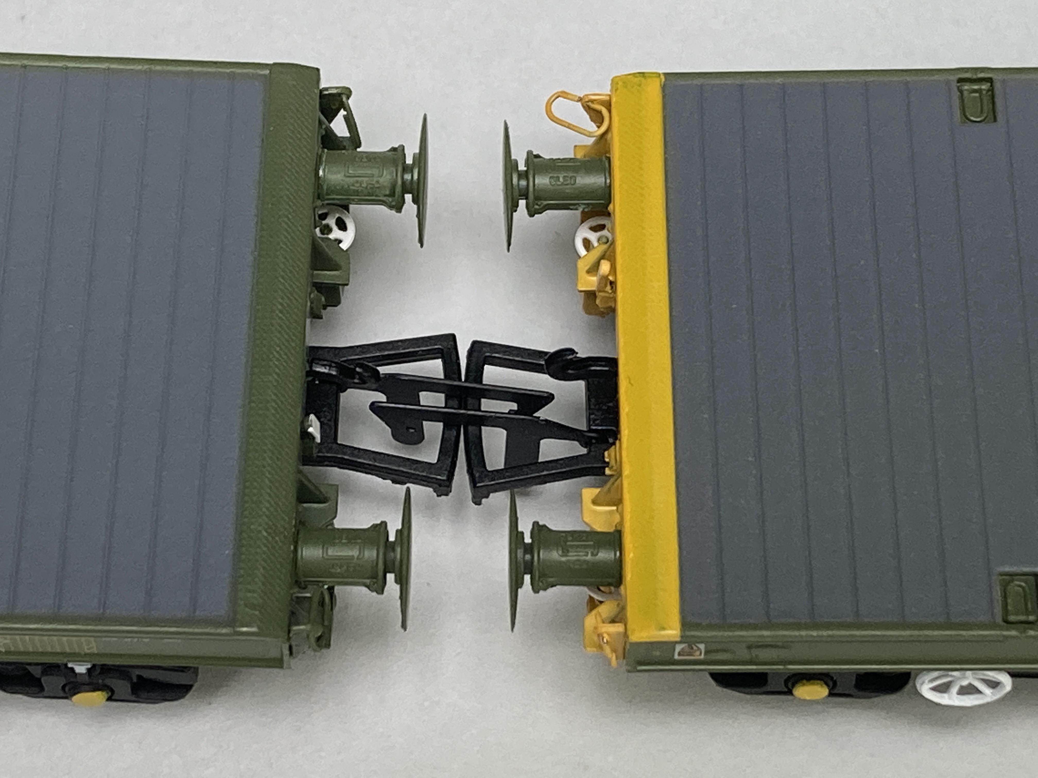 The packaging for them is simple and robust. A stiff outer carton and moulded ‘ice cube’ inner tray with close fitting lid holds the wagons securely including the detail pack of air hoses. all appear to be recyclable. With the first look at the wagons they are well assembled with no loose parts the paint and livery The wagons weigh in at 91grams each, the deck being a plastic moulding and the spinal frame underneath of metal. Looking at the running gear, wheels and axles are metal on 26mm standard axles housed in plastic bogies.