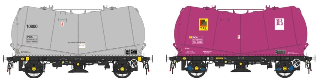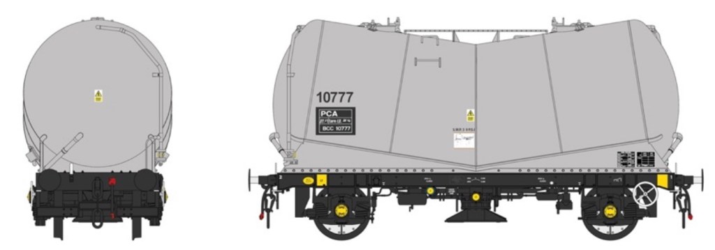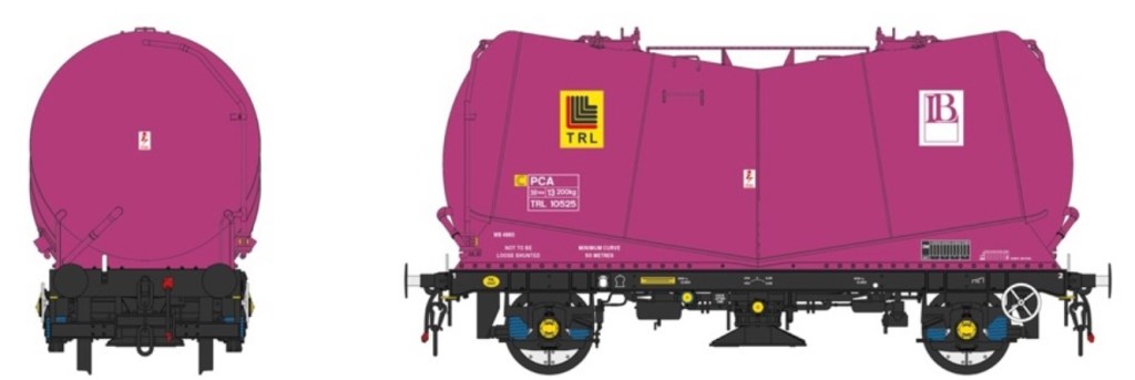 Featuring compensated axles, sprung buffers and Instanter couplings, fine pipework and underframe detail, separately fitted walkways, the model is based on the depressed centre PCA tanks used for cement and chemical traffic since the 1980s. The first batch includes no fewer than 10 individually numbered and decorated cement wagons (see artwork below), allowing customers to assemble realistic ready-to-run block trains. Also in development are similar wagons in Lever Brothers/Tiger Rail and Albright & Wilson liveries for powdered chemical traffic – ideal for 1980s/90s Speedlink trains.