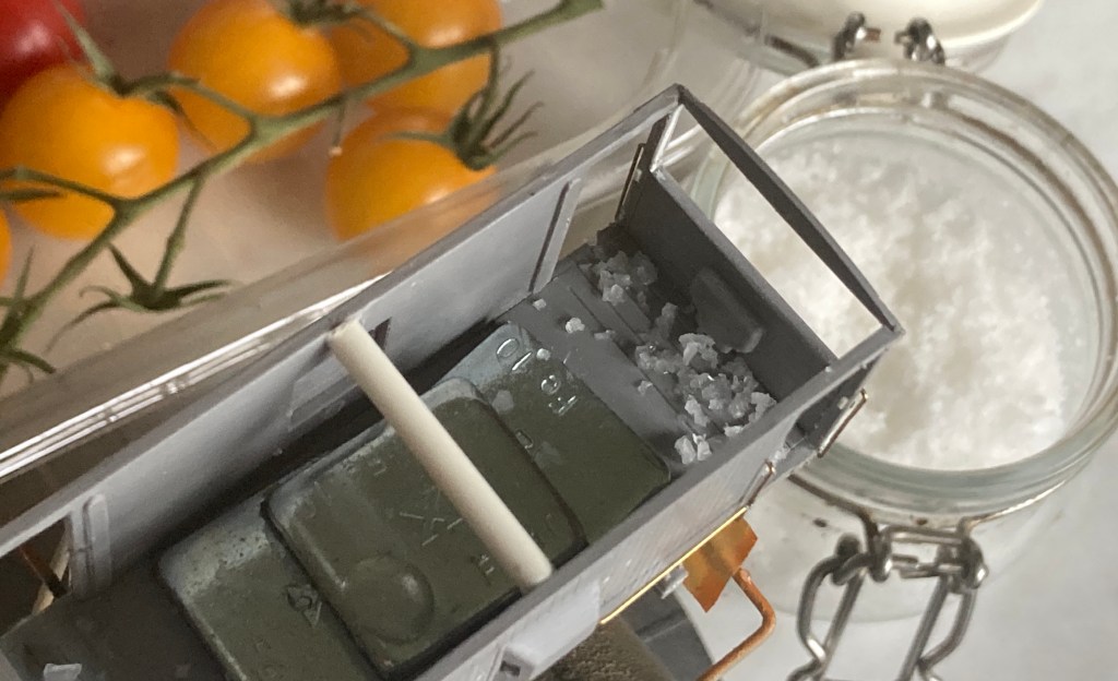 As this is going to be a battered example I wanted to try salt crystal weathering on the guard’s landing. This is where there’s been significant foot traffic and wear. So here’s some of Cornwall’s finest flakes being added to the mix. Basically wet the area you want masked and sprinkle the flakes into place. Let them dry and they adhere to the surface providing an irregular mask.
