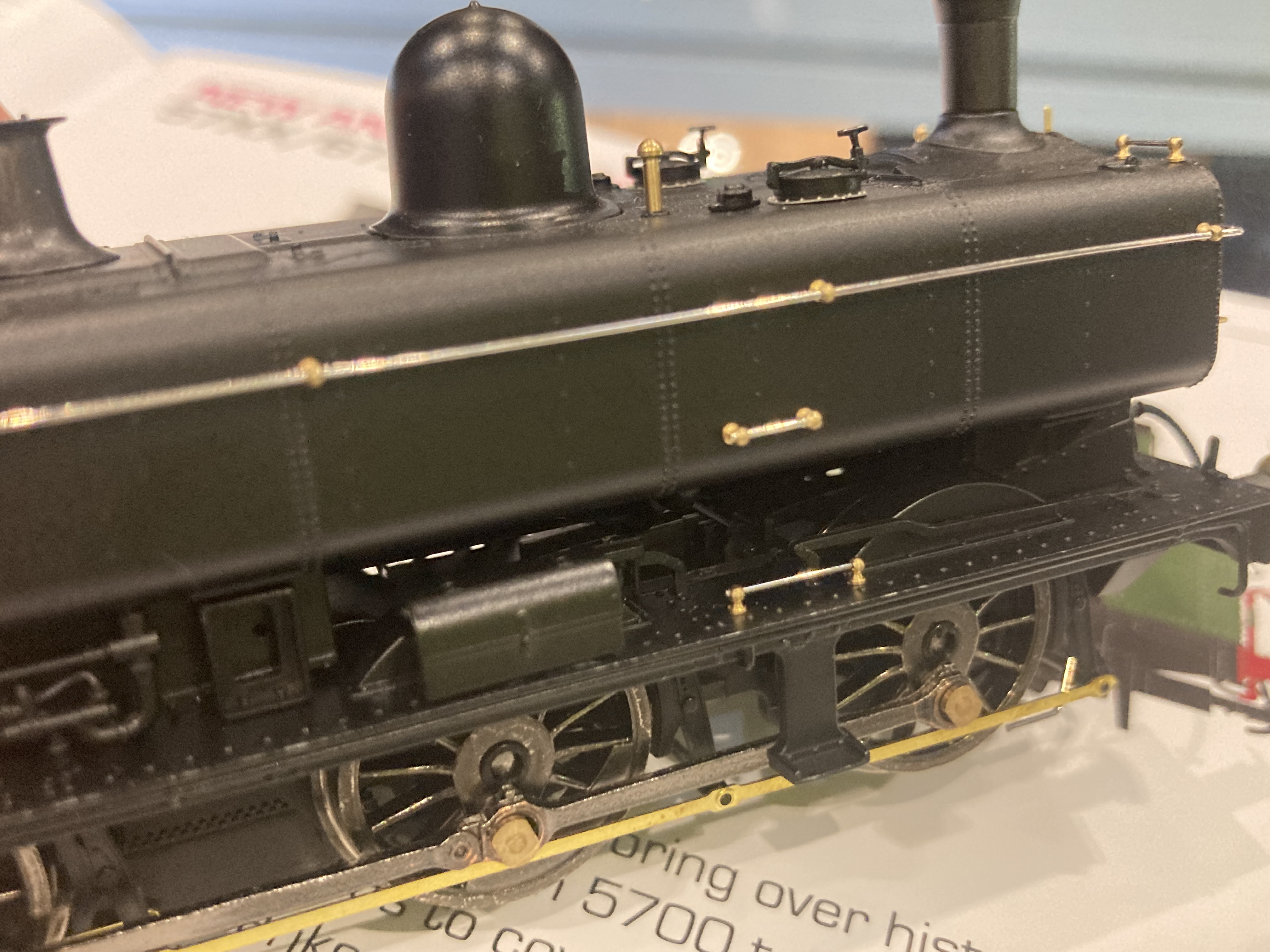 Another feature which caught my eye with the EP’s is the coupling rods are one pice rather than jointed. My preference is for the joint to be functional or alternatively hidden in an overlap on the central drive wheel. Accurascale have used solid rods on the J69 family and that works really well through second radius set track points. Other manufacturers have used them too recently, Heljan and Rapido so it may be a ‘habit’ thing for me. Brake pull rods are etched and this gives a marked visual difference to previous RTR models and sit very close to the wheel face, they also include the rear double pull rods which I don’t think has been on any previous RTR Pannier model. As part of the assembly the cross rods are alloy with plastic fittings to attach the pull rods to eliminate any electrical shorts. That seems a quite complicated assembly, but if they can be manufactured consistently it’ll help with the fine scale appeal of the model. The wheels look like they are fixed to 2mm diameter axles with shoulders, the spoke profile on these early EP’s is a bit one dimensional, not quite capturing the look of the prototype wheels. The wiper pick ups indicate these will be a conventional axle rather than a split chassis. The running plate is a metal casting and it was difficult to tell how much room there is between the wheel face and the inside of each splasher. This isn’t an issue for OO modellers but it may make conversion to wider gauges such as EM or P4 more challenging as there’s unlikely to be a simple drop in replacement without some work to be done around the brake gear assembly.