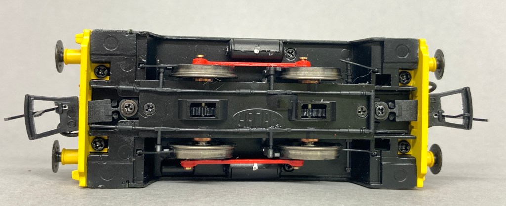 The metal chassis block is of split chassis construction with pickup collection through phosphor bronze axle bearings. There is some lateral movement on the axles and the brake shoes are in line with the wheel treads. I’ve not disassembled the chassis to assess EM/P4 capability, but there appears to be sufficient clearance behind the chassis air tanks, brake shoes will require adjusting. The gear train is only fitted to the rear driving axle. For me this is a sound decision as there’s no binding or cogging with this chassis on the gradients with or without loads. The phosphor bronze pickup collars are very effective for this split chassis design. The test track used has a good deal of uneven track and poor joints which usually find any weak spot with a traditional pick up strip bearing on wheel treads or tyres, this model was not troubled by any of the track it was tested on.