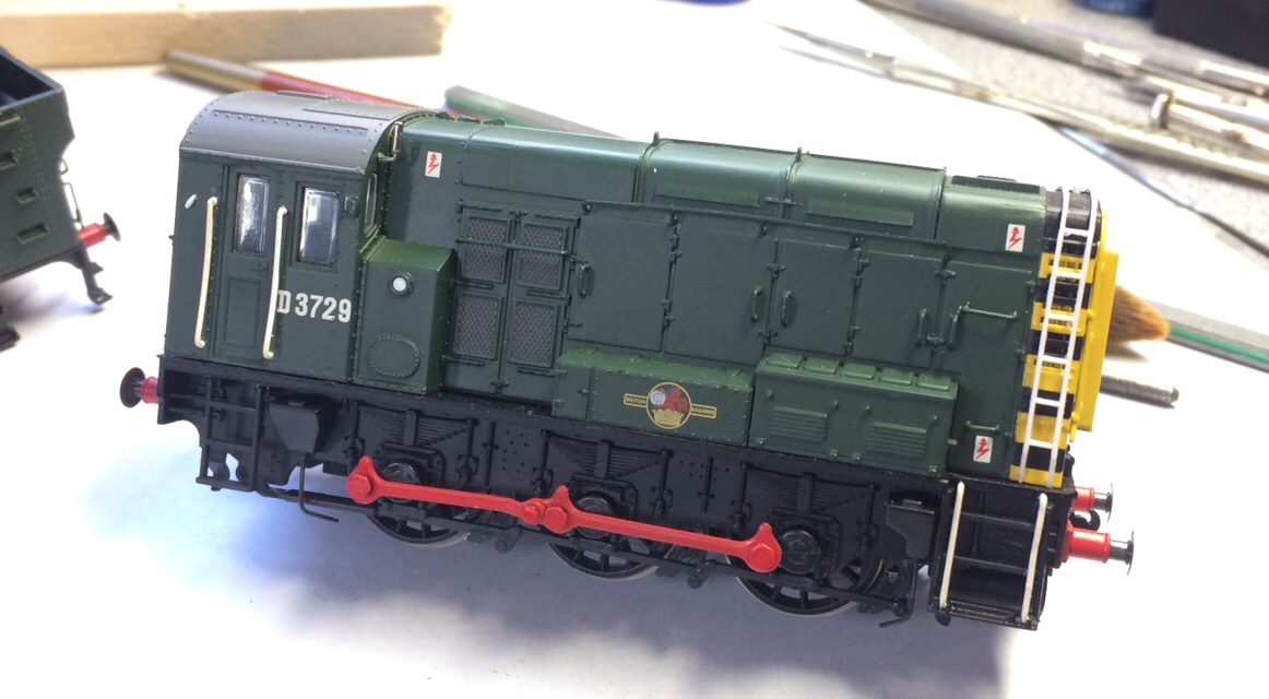 New Identity. I’ve used a mix of waterslide decals from my unused spares box, I’ve chosen Southern Railway O gauge wagon numbers for the locomotive number, and a couple of 1/72 data panels from an old P51 Mustang sheet. It’s freelance so it doesn’t matter and you can stamp your own identity on the model. I placed numbers on the bufferbeams too, giving a company style type of look. To finish I added overhead warning panels around doors and step areas. I’ve used microsol setting solution to unsure the decals seat correctly with no silvering, this paint gives a satin sheen which also helps with the decal adhesion.