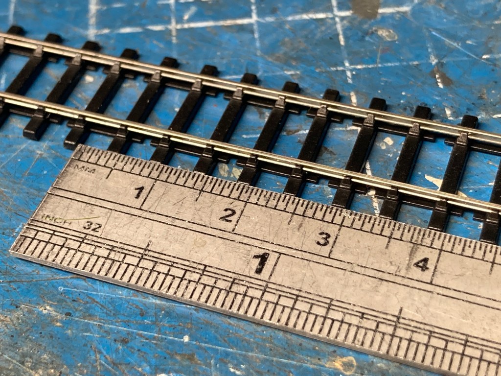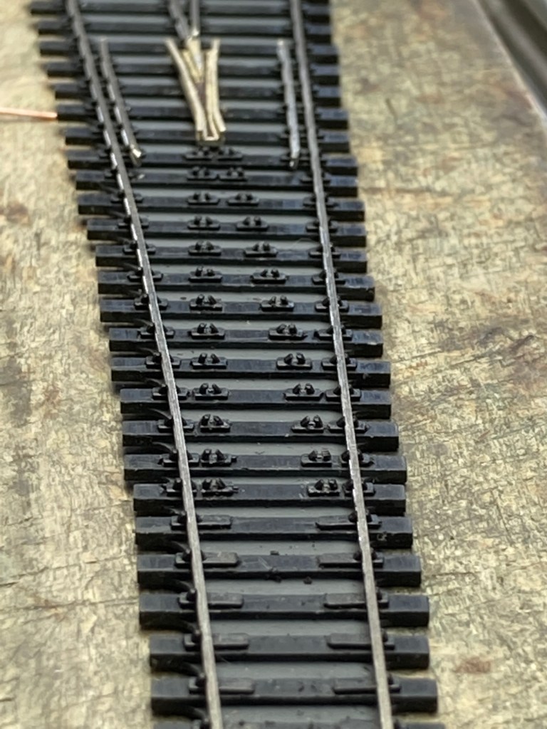 We can see in the earlier picture that there’s not a big difference between a Peco OO large radius point footprint and this N B7, and the opportunity to use a shelf layout volume I’m familiar with, and applying it to 2mm N gauge is beginning to scratch that itch.